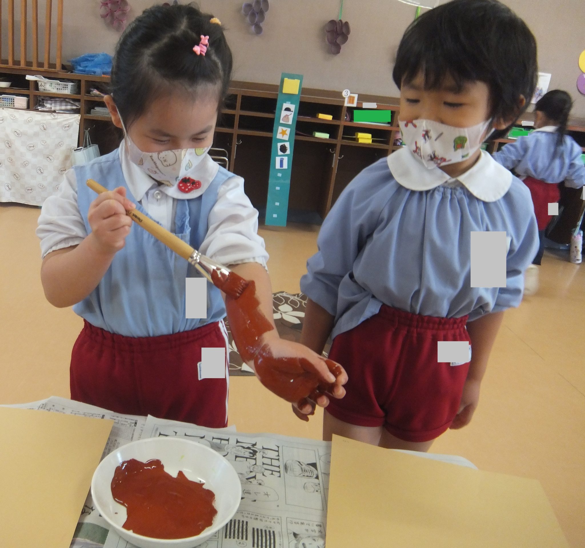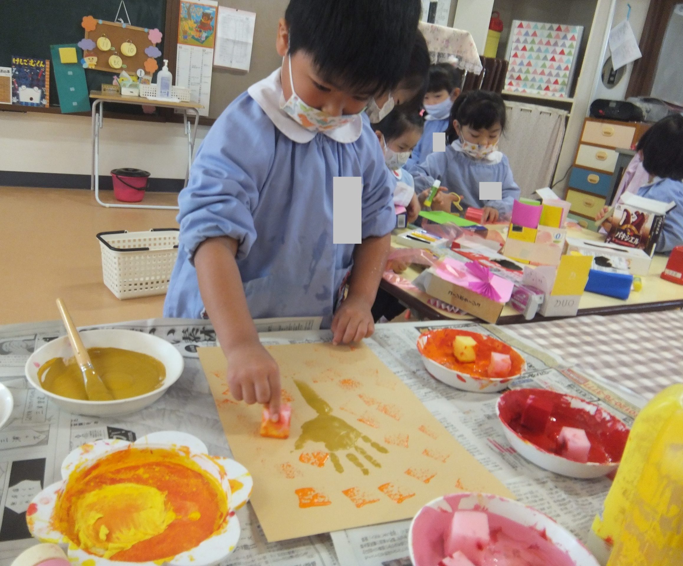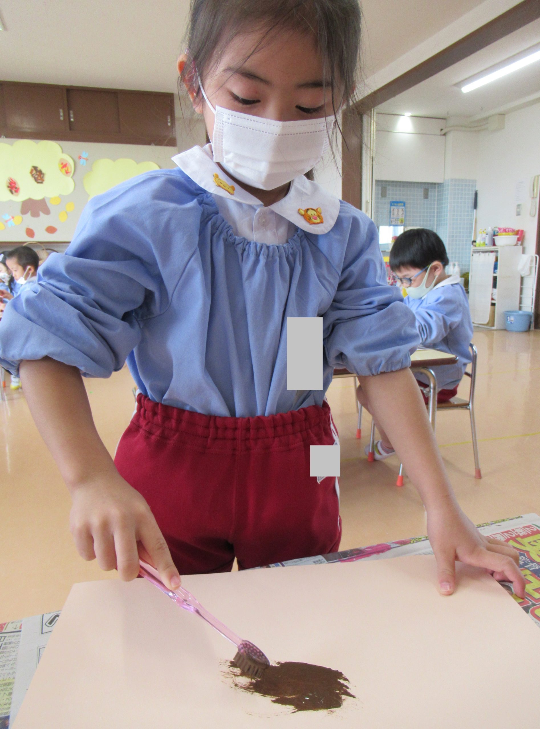 ☆うさぎ組さんは、絵の具を使い、紅葉した木を描いていました!!