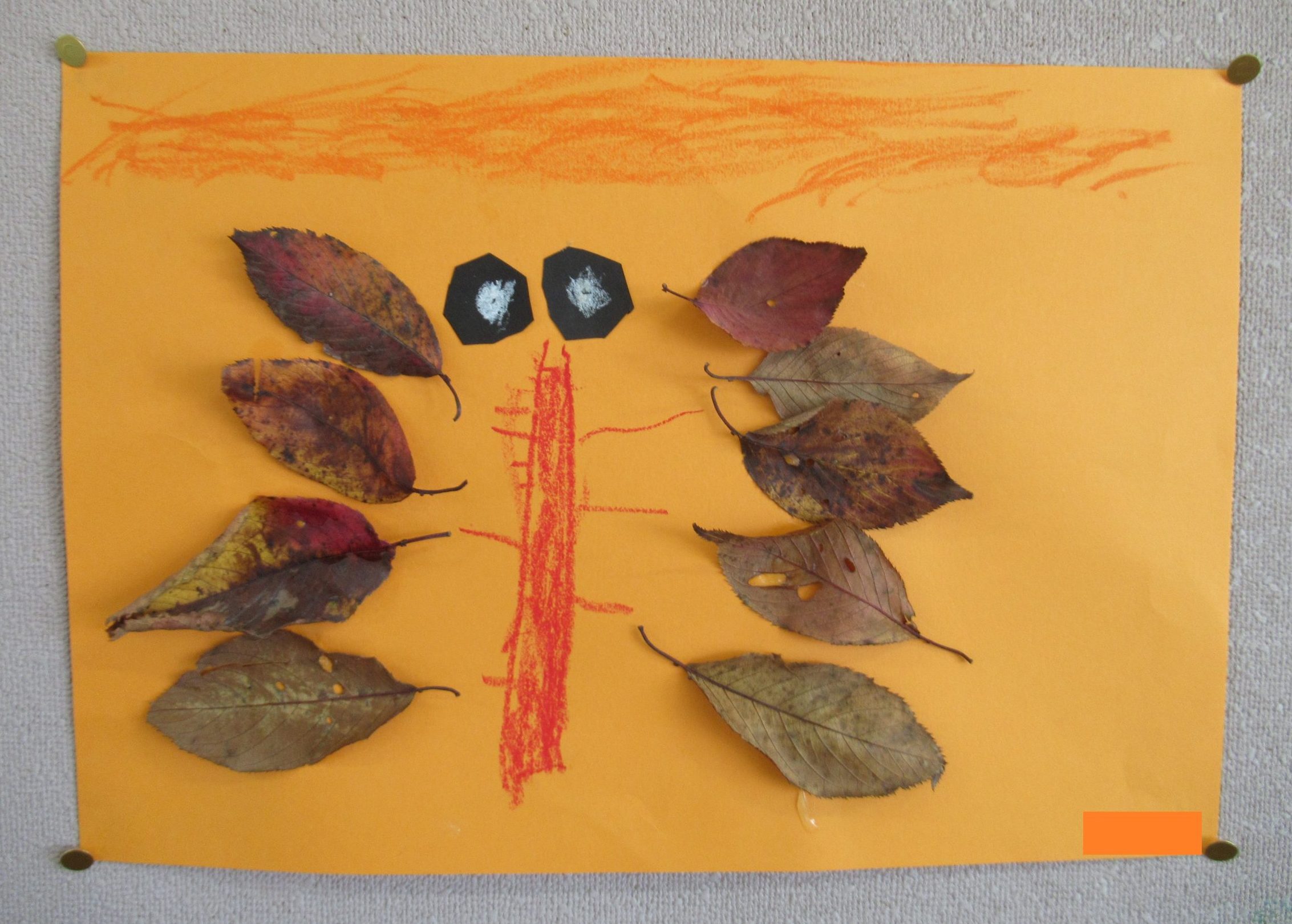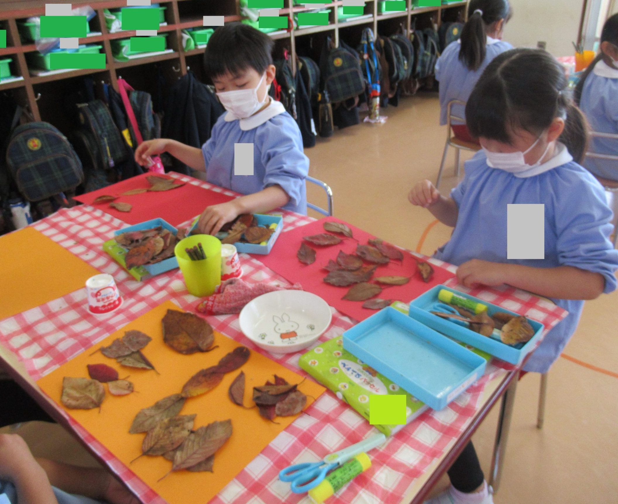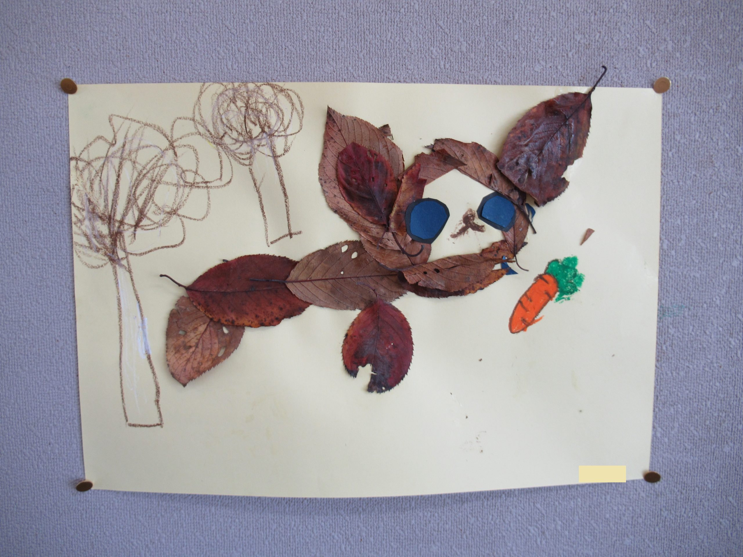 ☆ぱんだ組さんは、園庭の葉っぱを集め、葉っぱを使った、壁に飾る作品に取り組んでいました!!