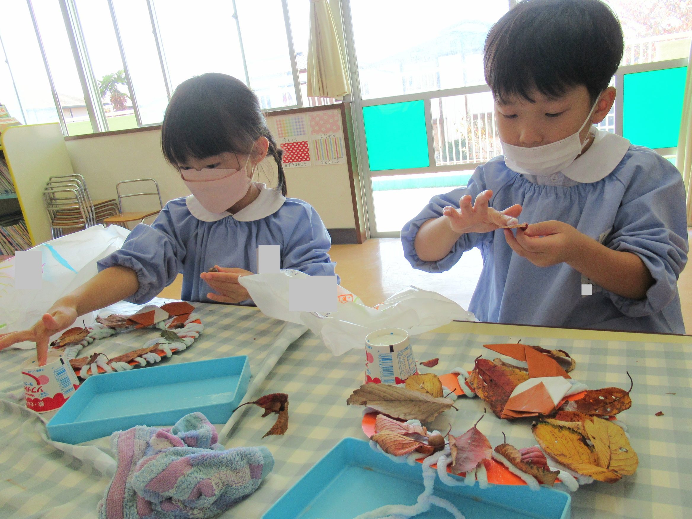 ☆折紙や葉っぱをリースに貼り合わせていました✨
