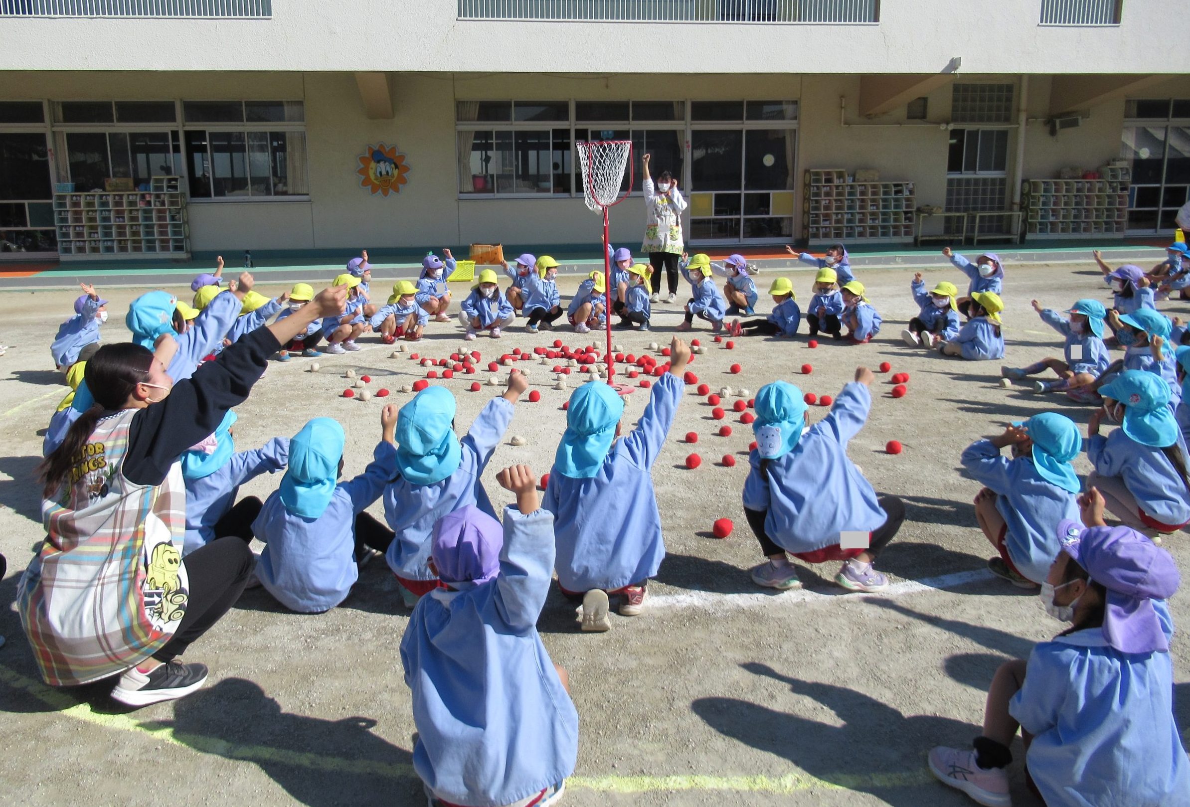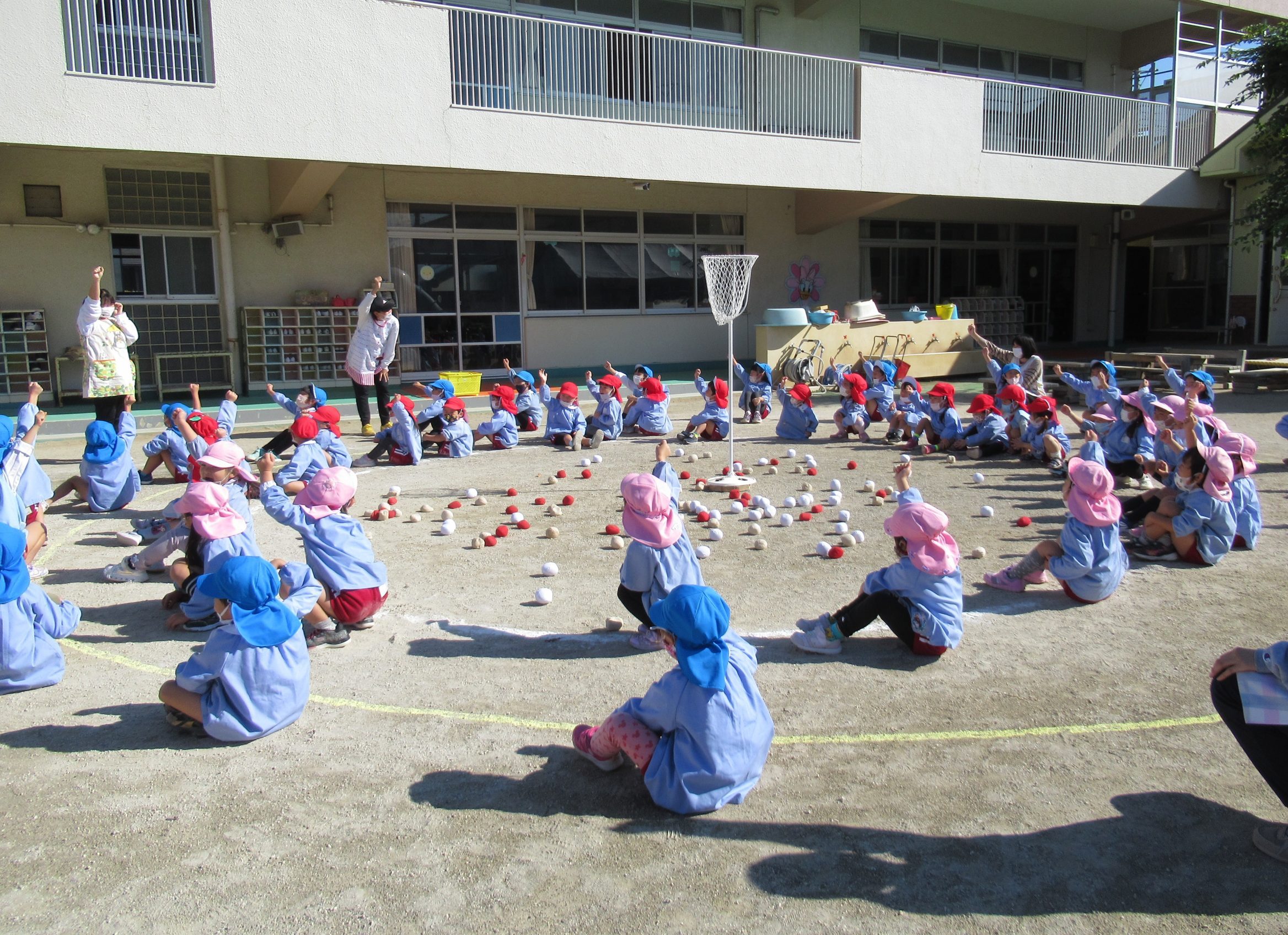 ☆みんなで園庭に集合し、玉入れのルールの確認をしました!!