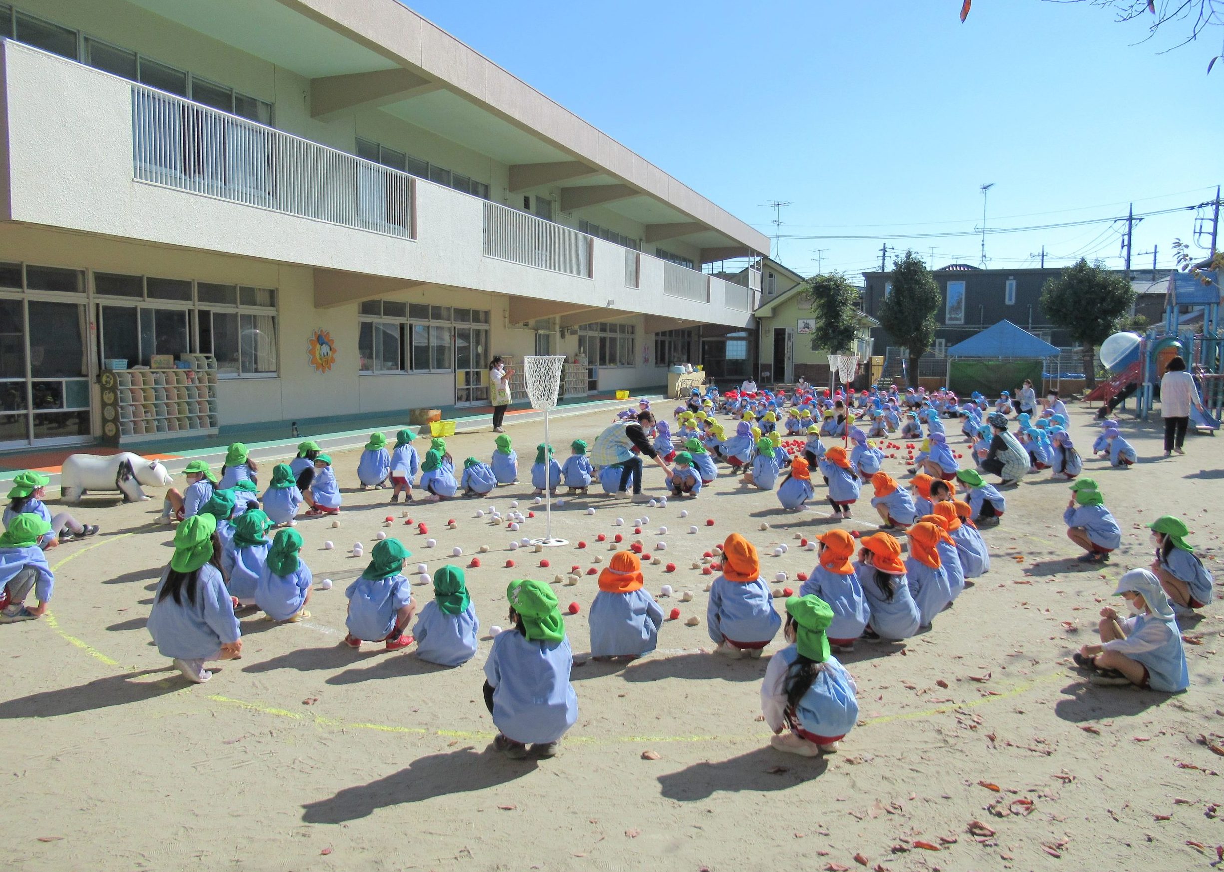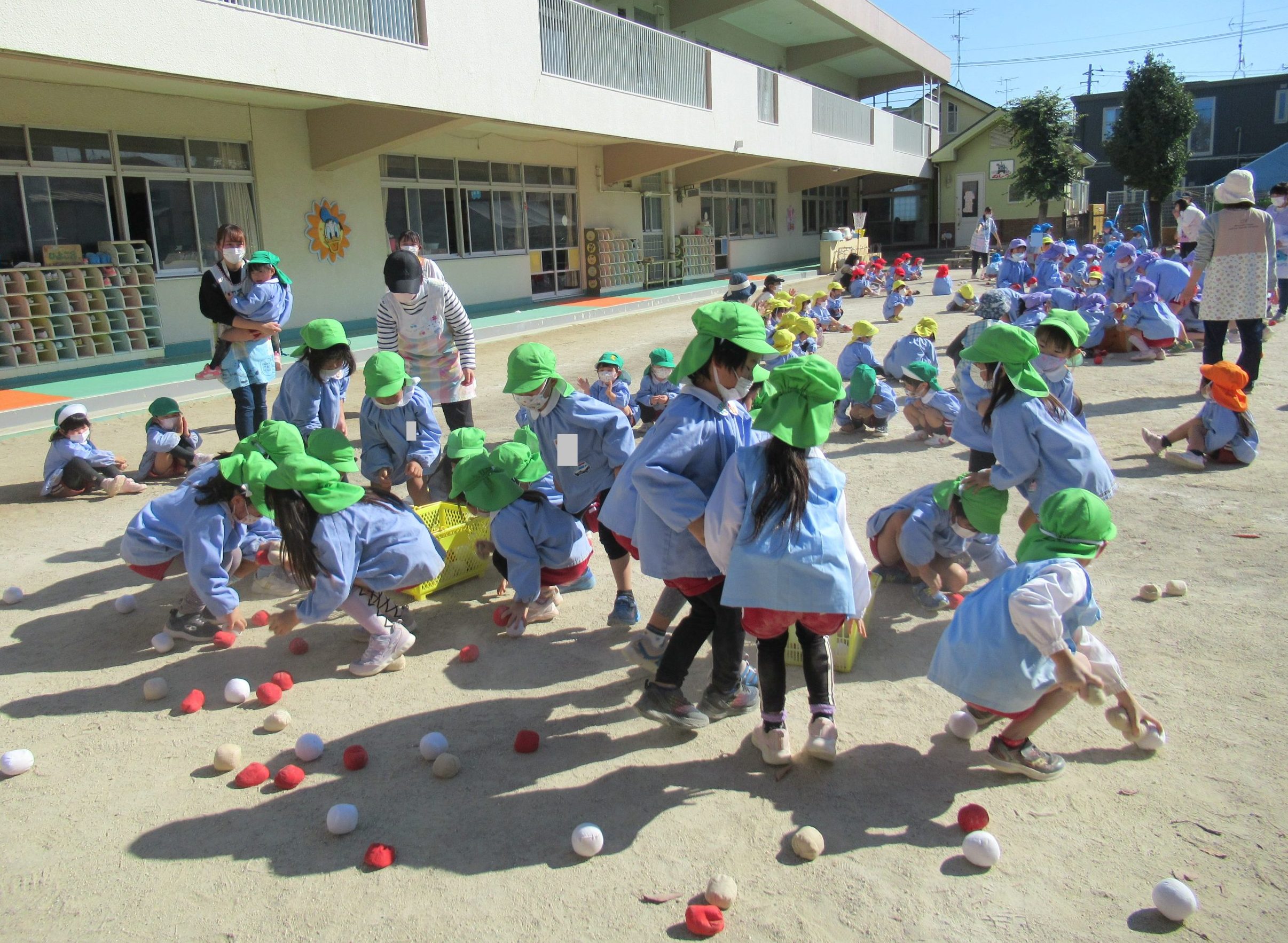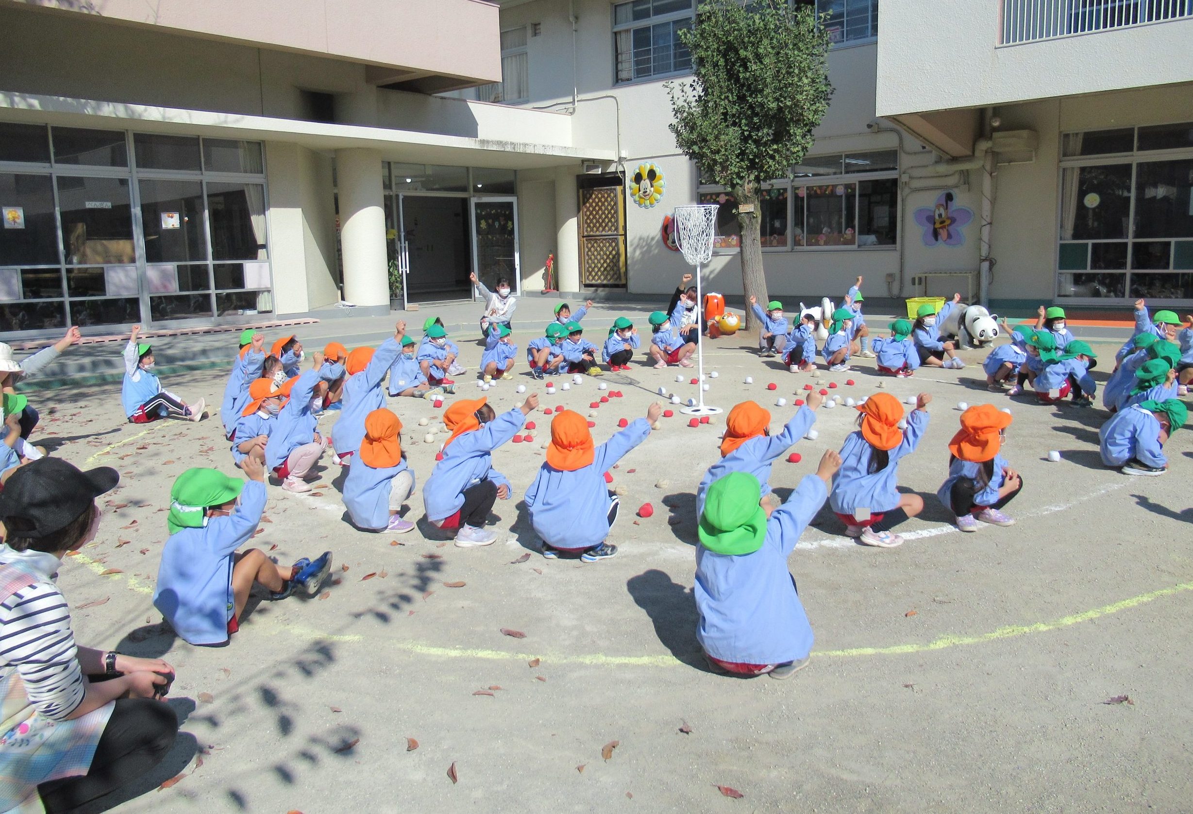 11月8日(火)に、年少組、年中組、年長組のたてわりで、ひよこ1組さん・うさぎ組さん・ぞう組さんの『あかチーム』、ひよこ2組さん・ぺんぎん組さん・きりん組さんの『きいろチーム』、ひよこ3組さん・りす組さん・ぱんだ組さんの『みどりチーム』で玉入れを行いました!!