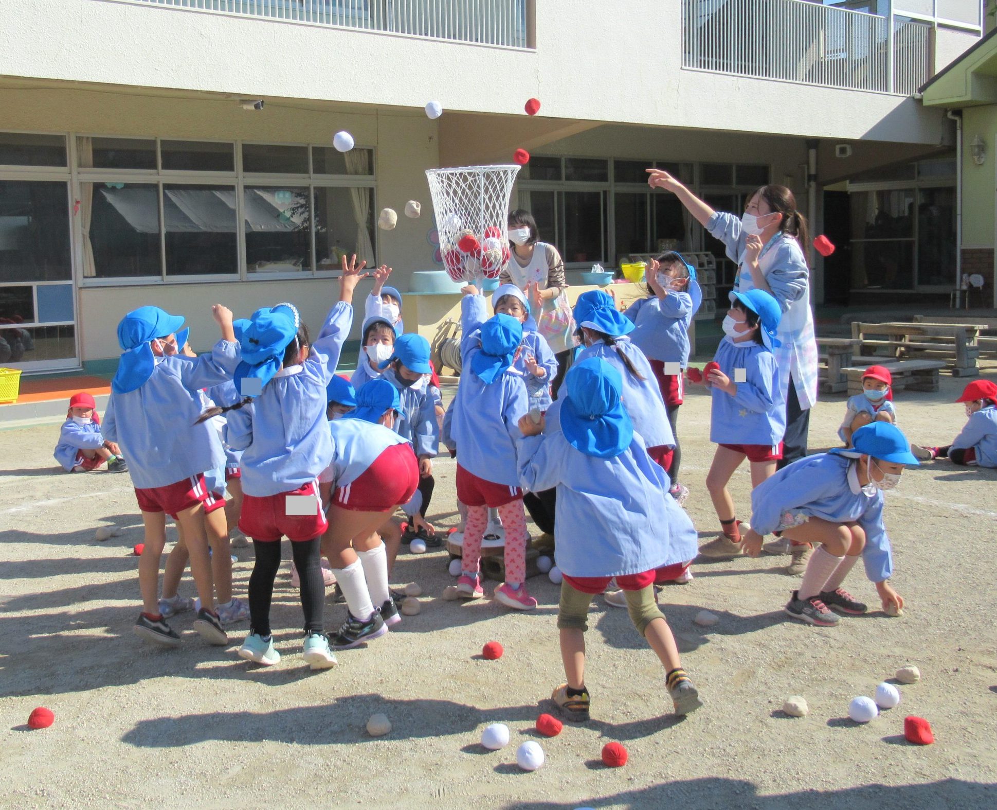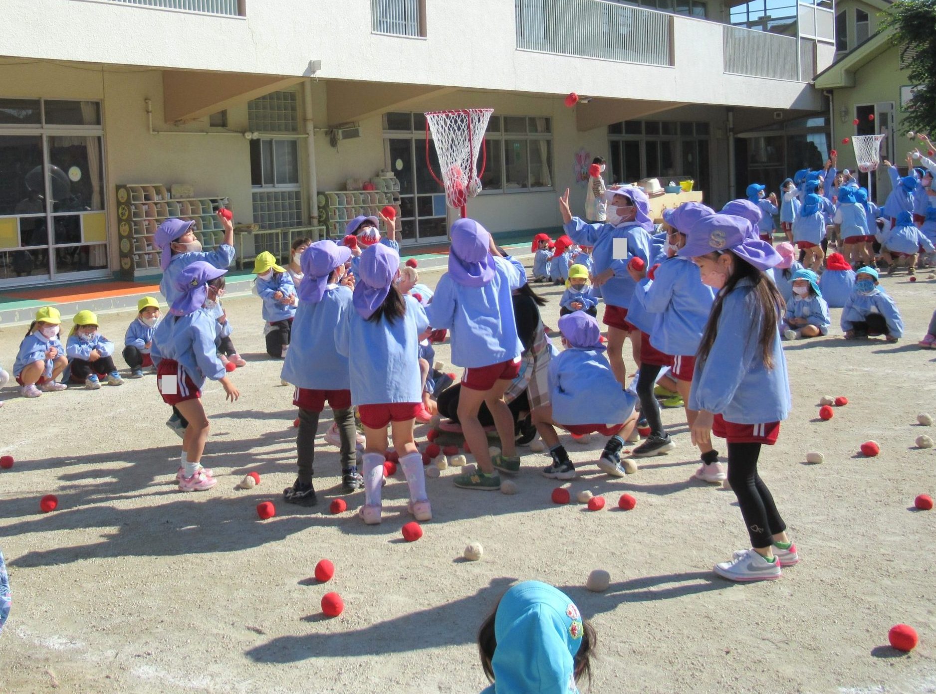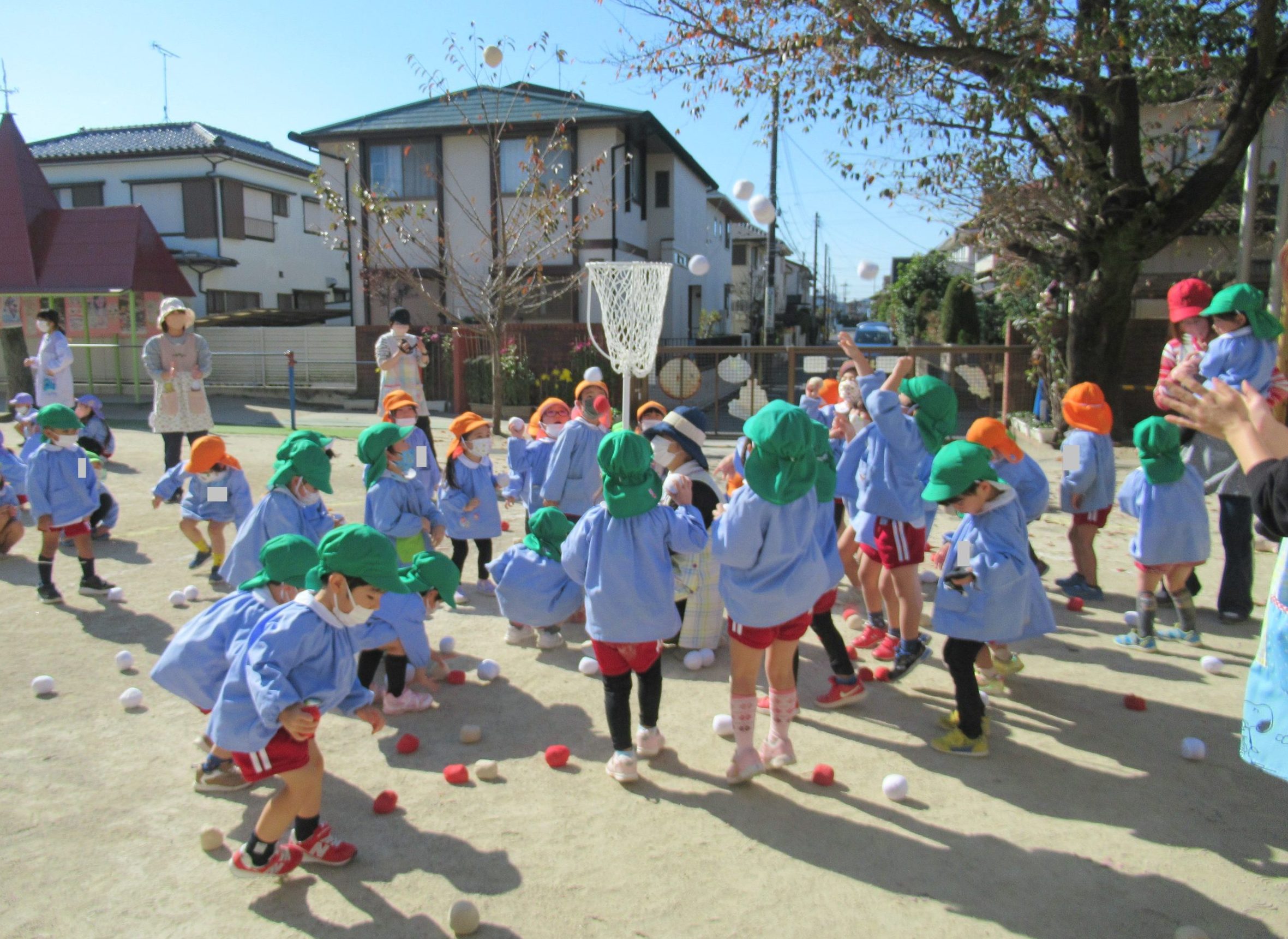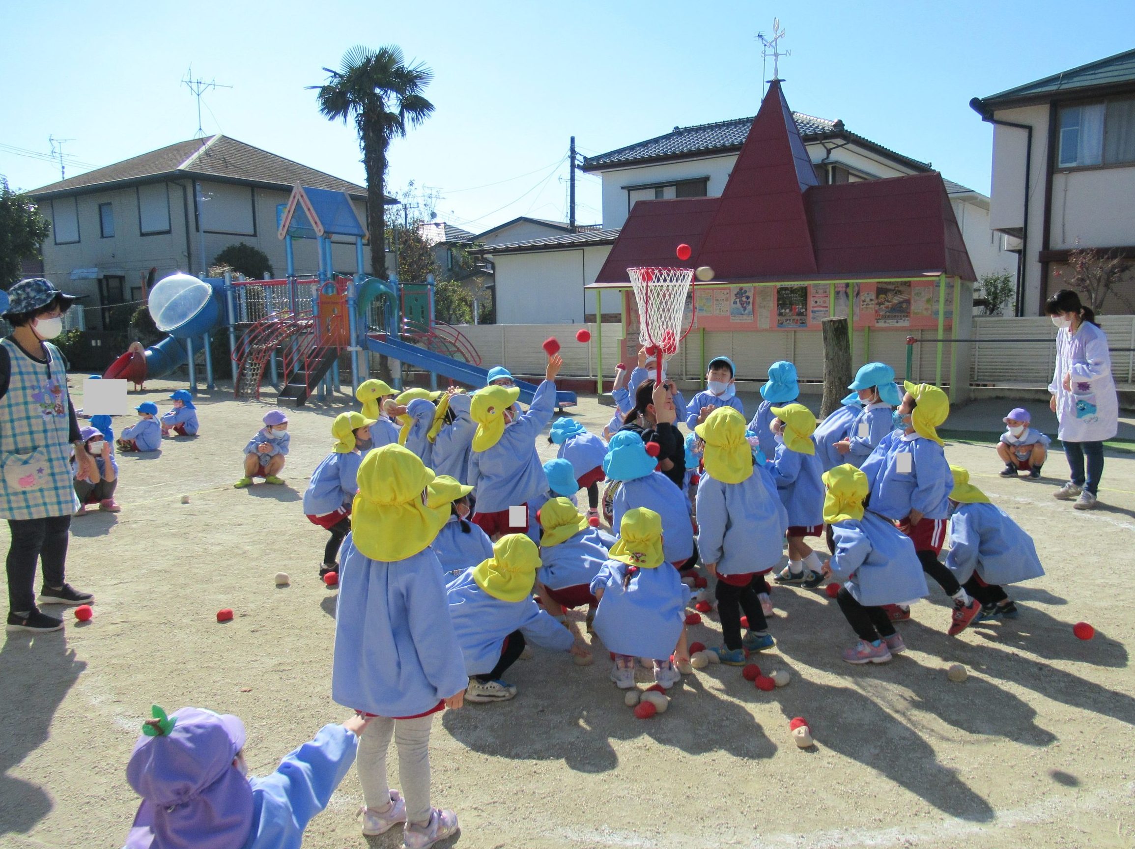 11月8日(火)に、年少組、年中組、年長組のたてわりで、ひよこ1組さん・うさぎ組さん・ぞう組さんの『あかチーム』、ひよこ2組さん・ぺんぎん組さん・きりん組さんの『きいろチーム』、ひよこ3組さん・りす組さん・ぱんだ組さんの『みどりチーム』で玉入れを行いました!!