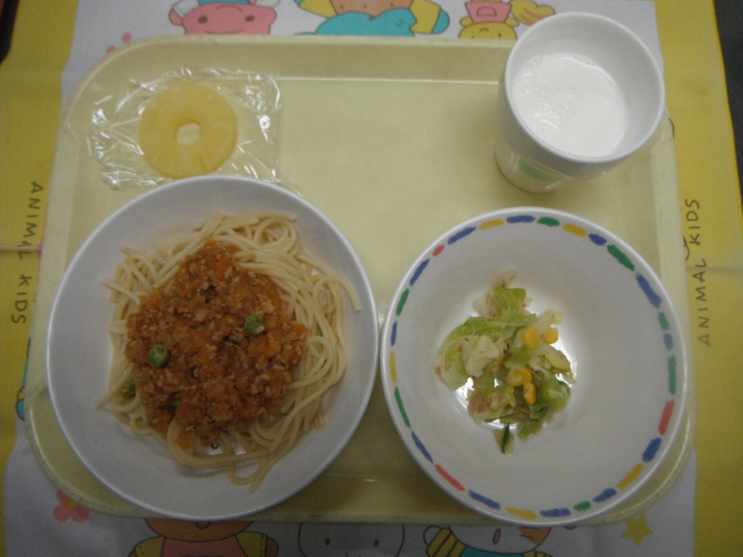 2月27日(月)ミートソーススパゲッティー・白菜とツナのサラダ・牛乳・パイン缶