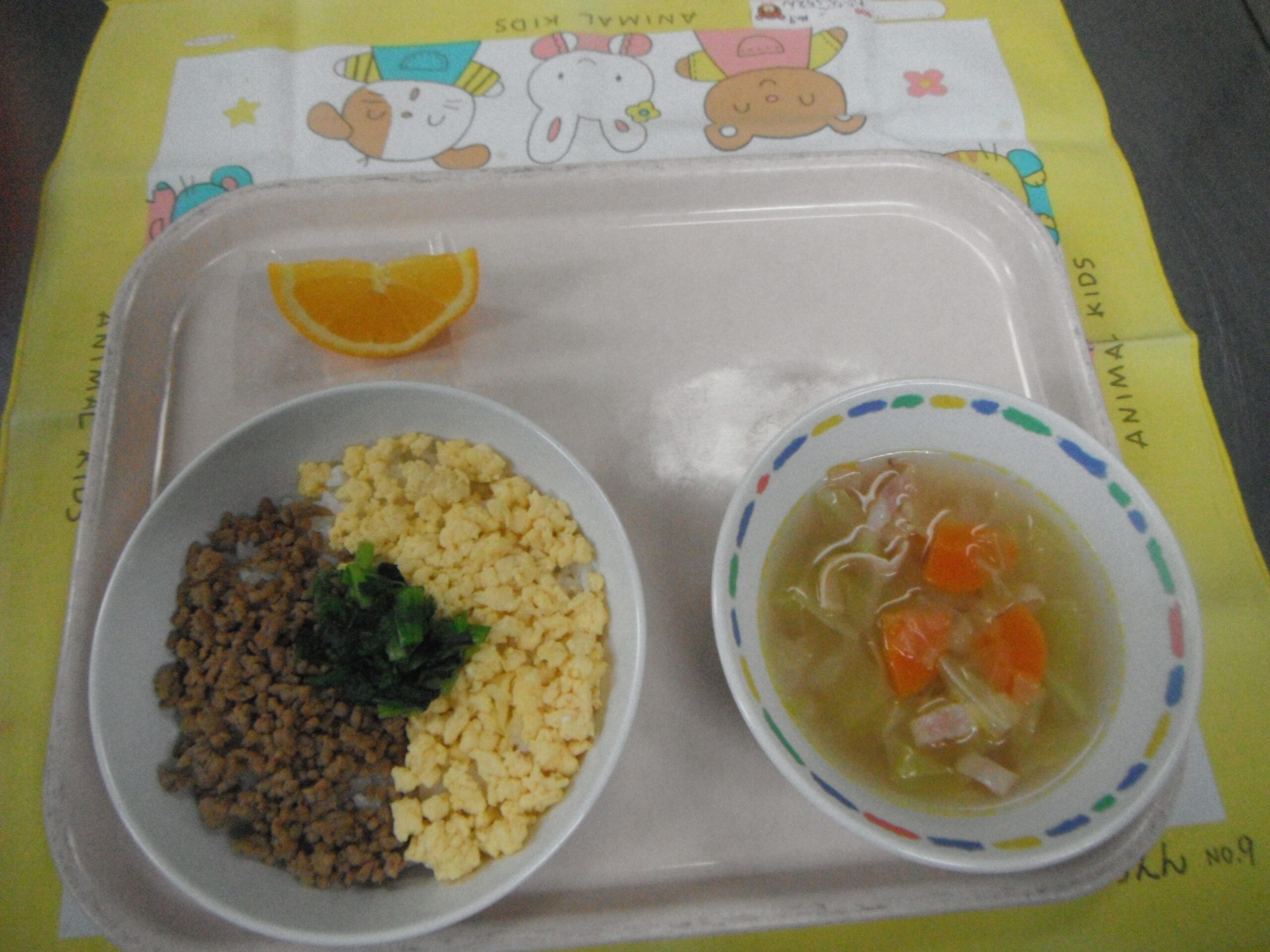 3月1日(水)三食丼・ベーコンとキャベツのスープ・オレンジ