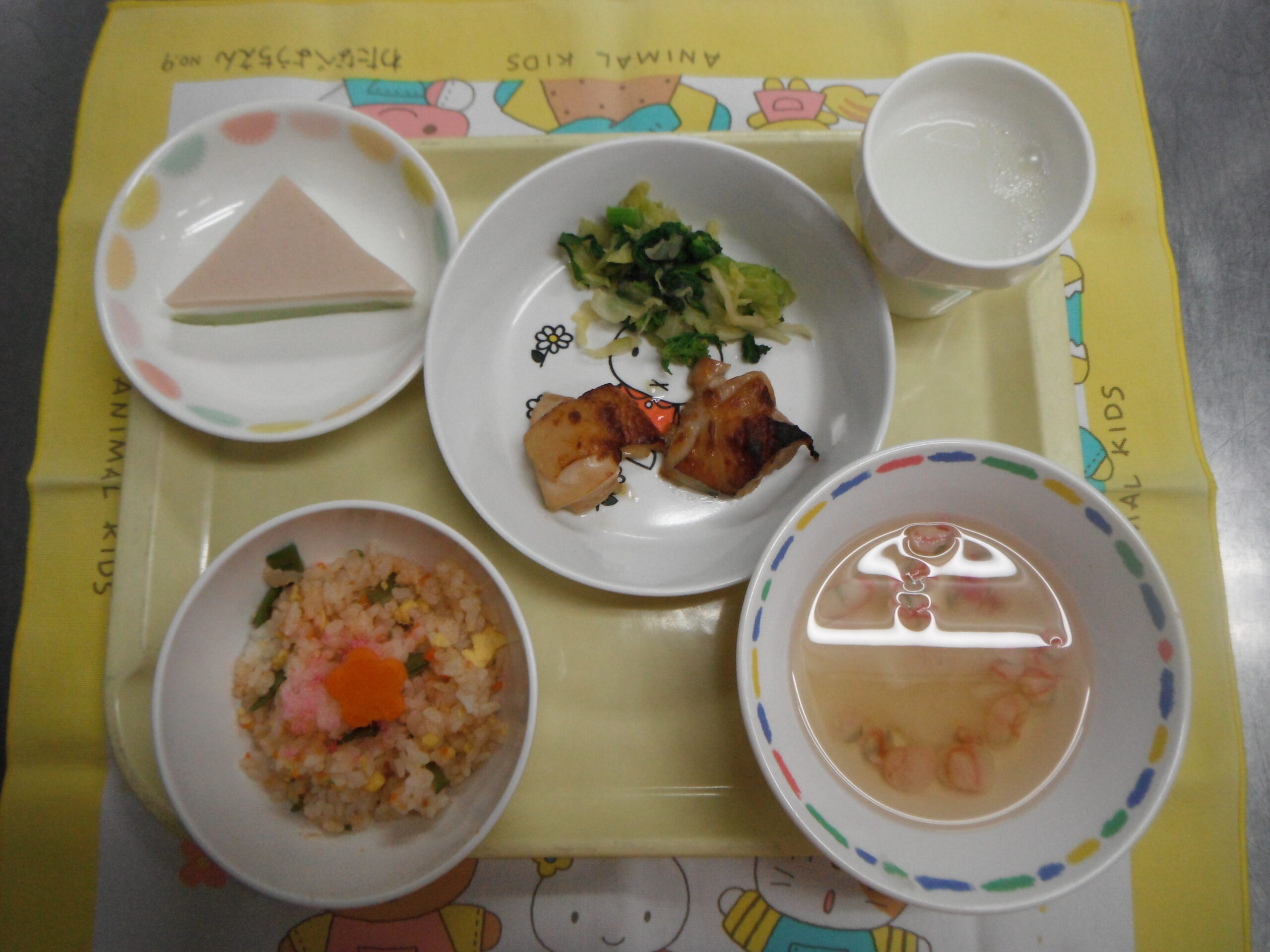 3月2日(木)彩りご飯・鶏肉の照り焼き・菜の花のお浸し・てまり麩のお吸い物・カルピス・ひな祭りゼリー