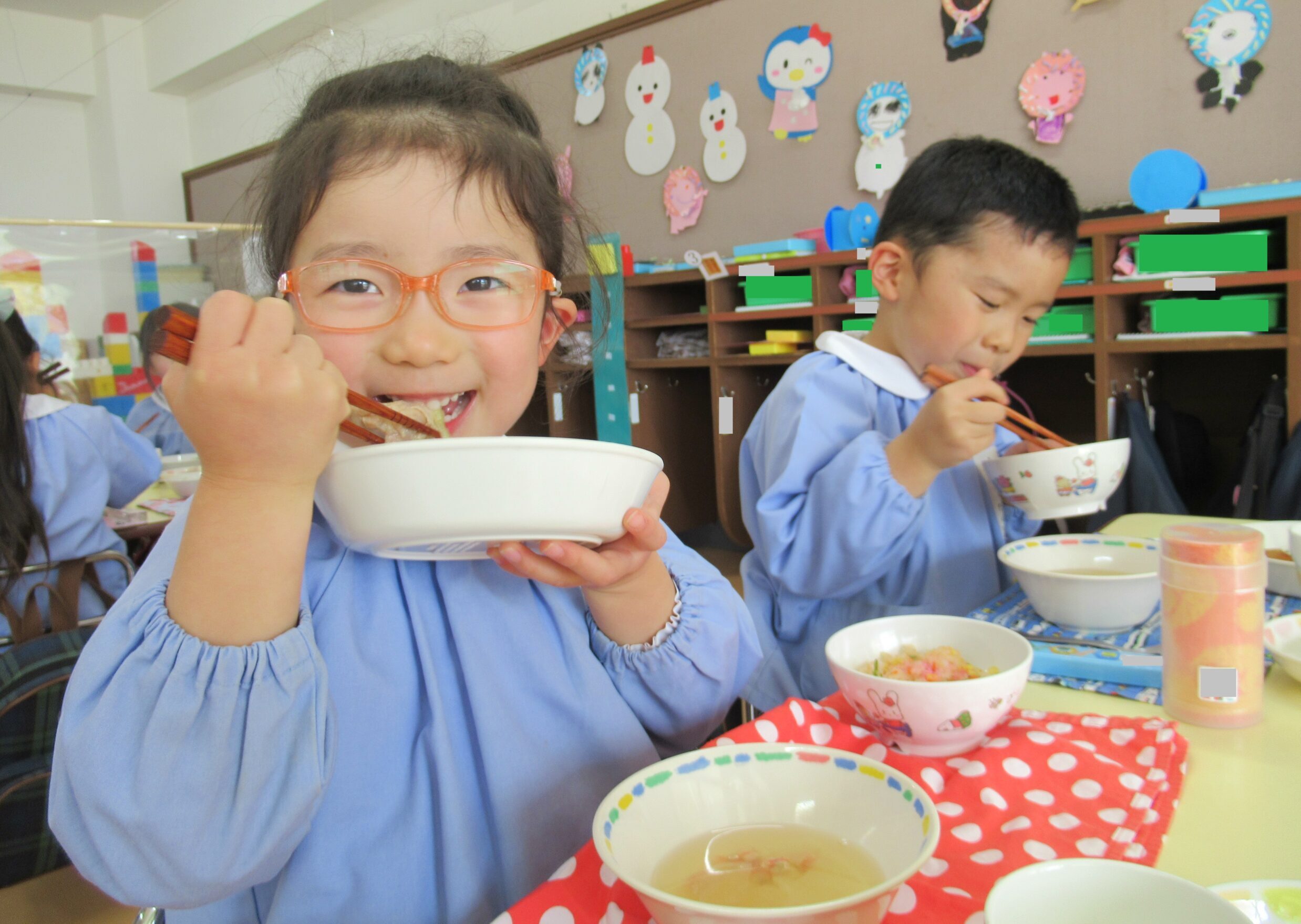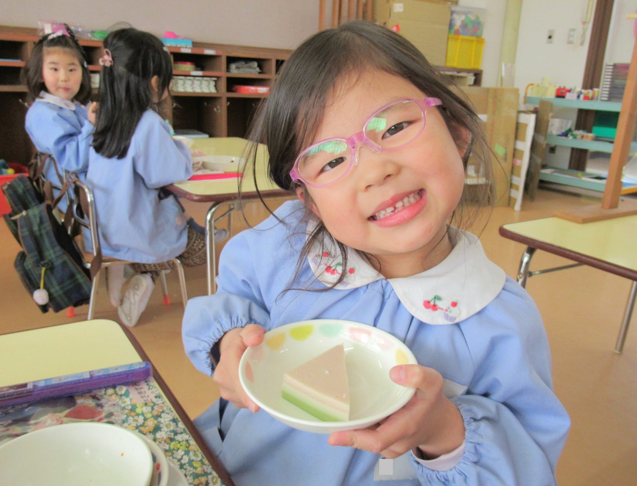 彩りごはんには、さけ・たまご・にんじん・きぬさやを混ぜ込み、桜でんぶとお花の人参をのせました。菜の花のお浸しは、お醬油とだし汁のシンプルな味付けです。三食ゼリーは、牛乳ベースで緑・白・赤のひしもちにみたてたゼリーを作りました!