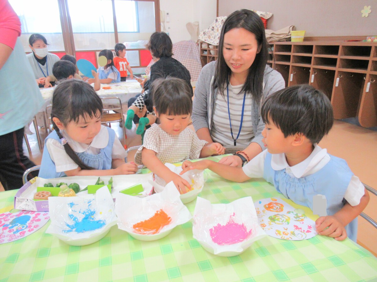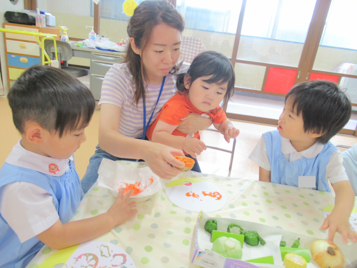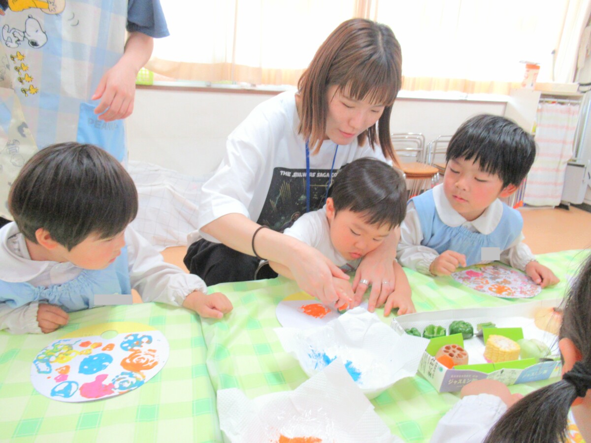 ☆うちわの裏面は、様々な野菜を使い、絵の具をつけて野菜スタンプで模様をつけました🎵