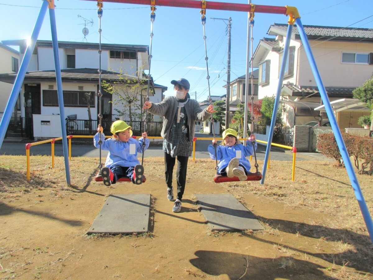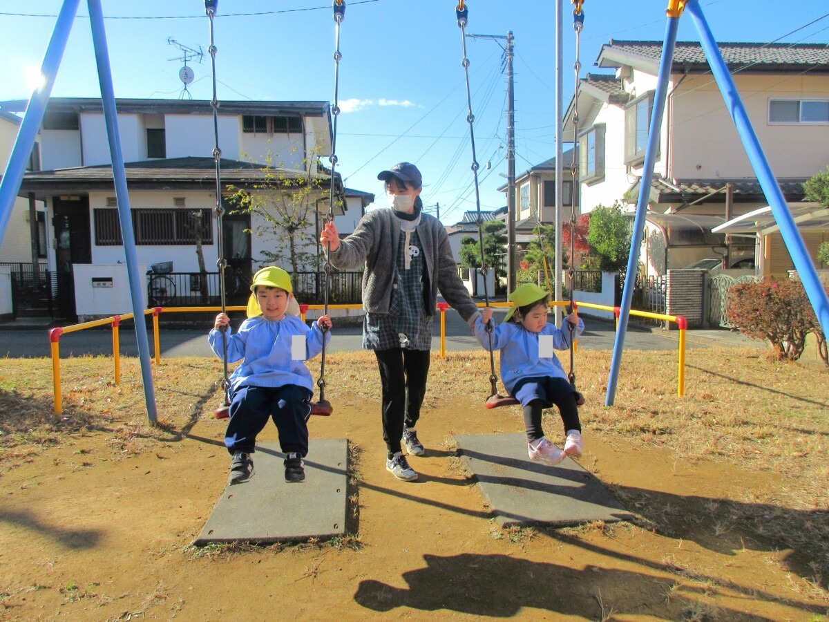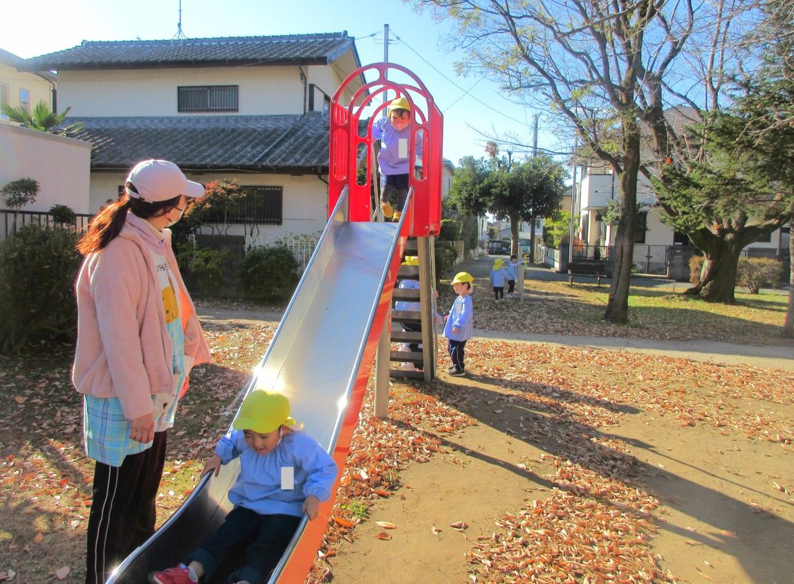 ホーム > 保育 > ひよこ2組さん 園外保育☆ 2024/12/12 12月12日(木)に、ひよこ2組さんが近くの公園にあそびに行っていました🎵 ☆ゆっくりブランコや滑り台などの遊具であそんだり、落ち葉を集めてあそんだり、のんびりゆっくり楽しそうにあそんでいました✨ ニコニコの笑顔がたくさん見られました😊✨ - 保育