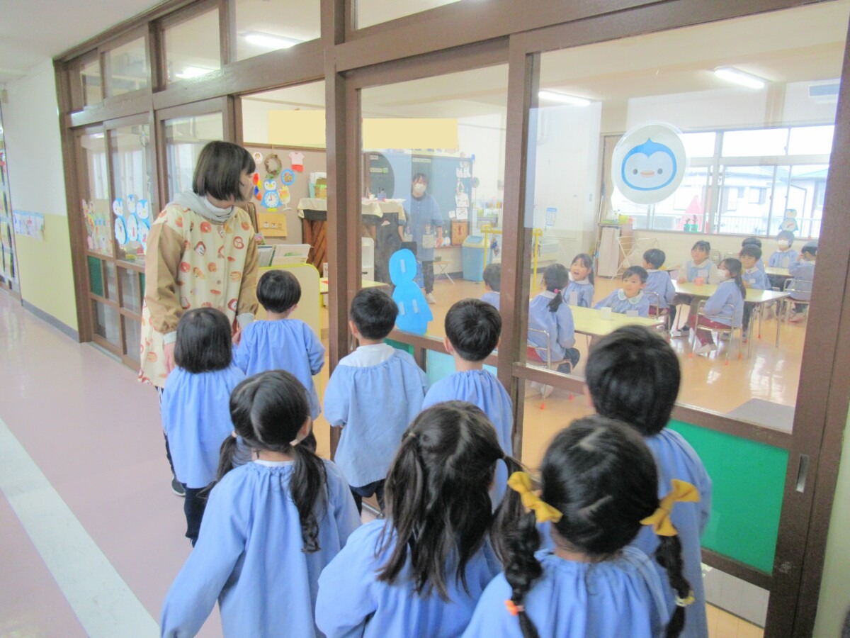 ☆ひよこ3組さんは、進級に向けて、年中組さんのぺんぎん組さんのお部屋に行き、虫歯にならないためのフッ化物洗口の様子や朝の集まりの様子を見せてもらっていました!!