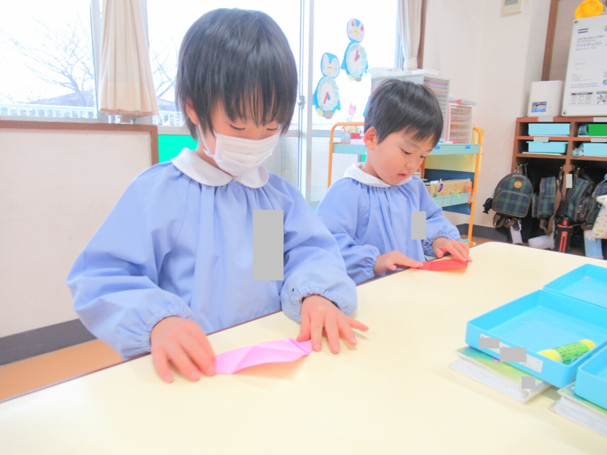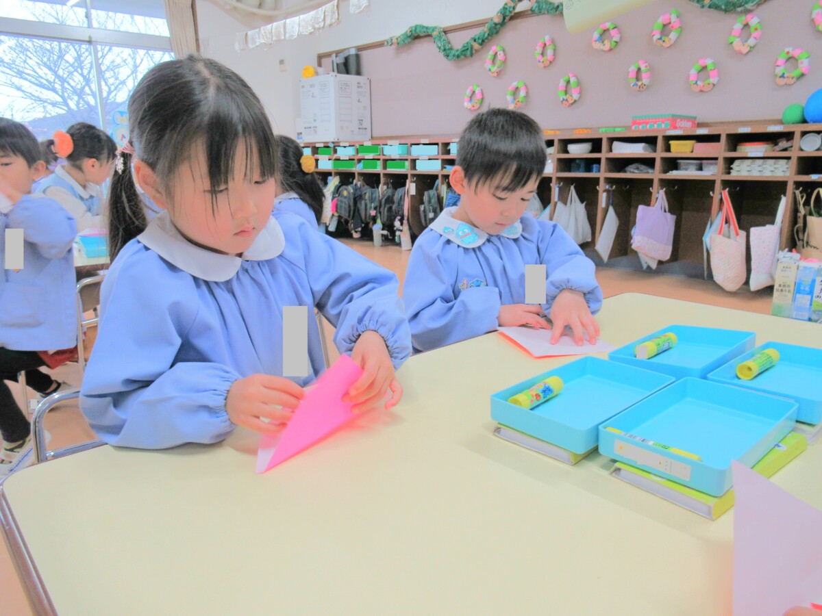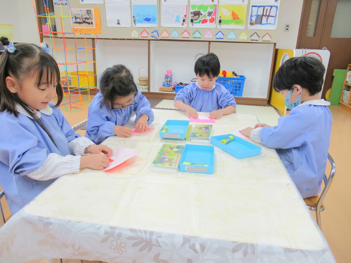 ☆年中組さんは、折紙で『梅』の製作に取り組んでいました🎵