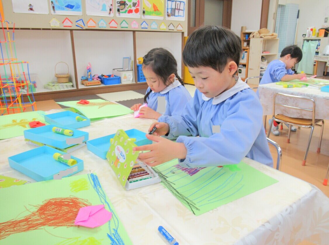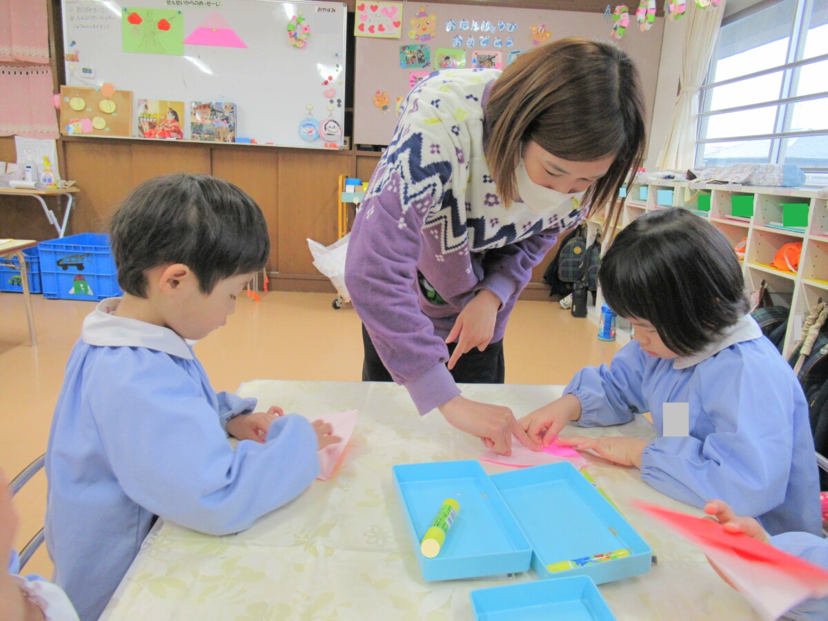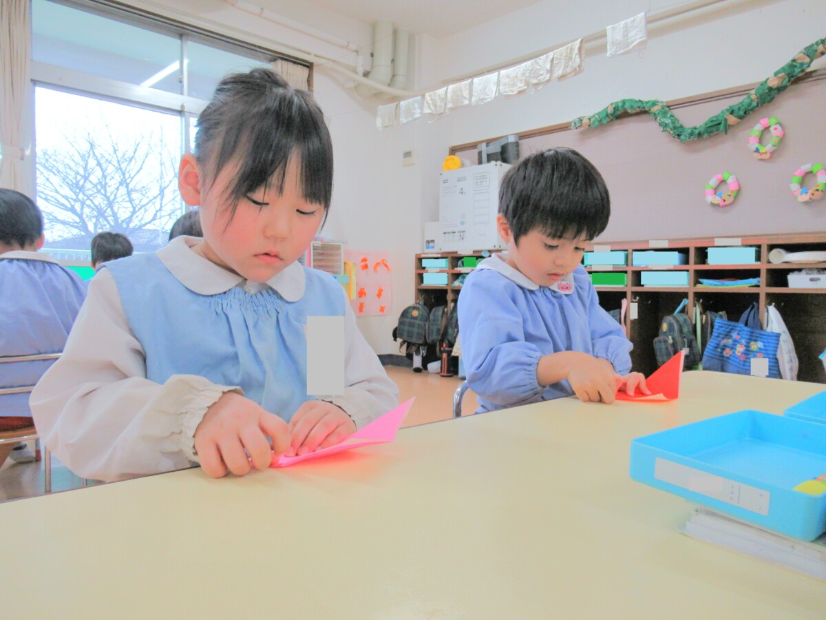 ☆年中組さんは、折紙で『梅』の製作に取り組んでいました🎵