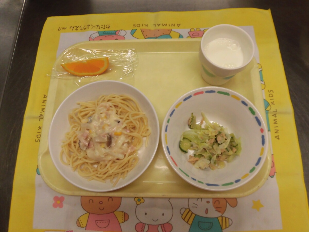 6月2日(月)コーンクリームスパゲティー・フレークサラダ・牛乳・おれんじ
