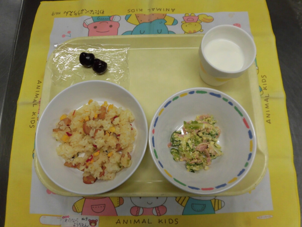 6月3日(火)カレーピラフ・ミモザサラダ・牛乳・アメリカンチェリー