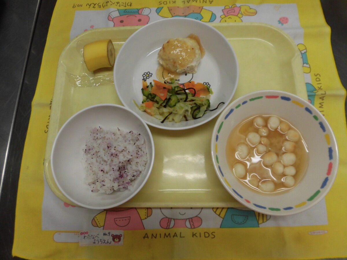 6月4日(水)ゆかりご飯・豆腐ハンバーグ(おろしソース)・野菜の塩昆布和え・たまねぎと麩の味噌汁・バナナ