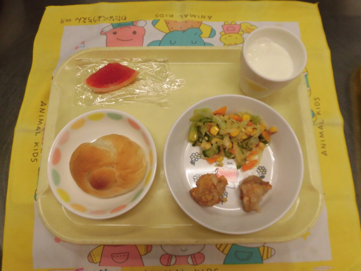 6月5日(木)テーブルロール・鶏肉のから揚げ・コーンサラダ・牛乳・グレープフルーツ