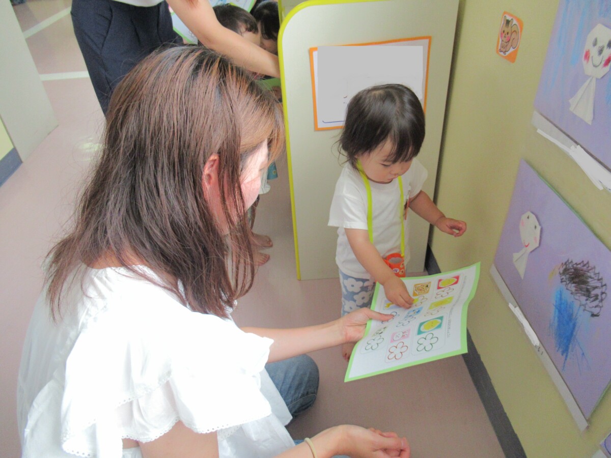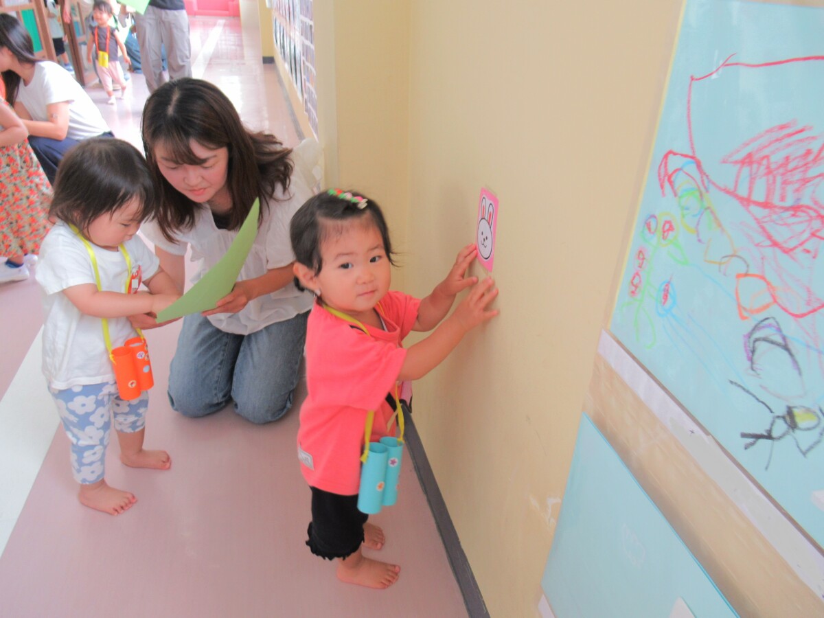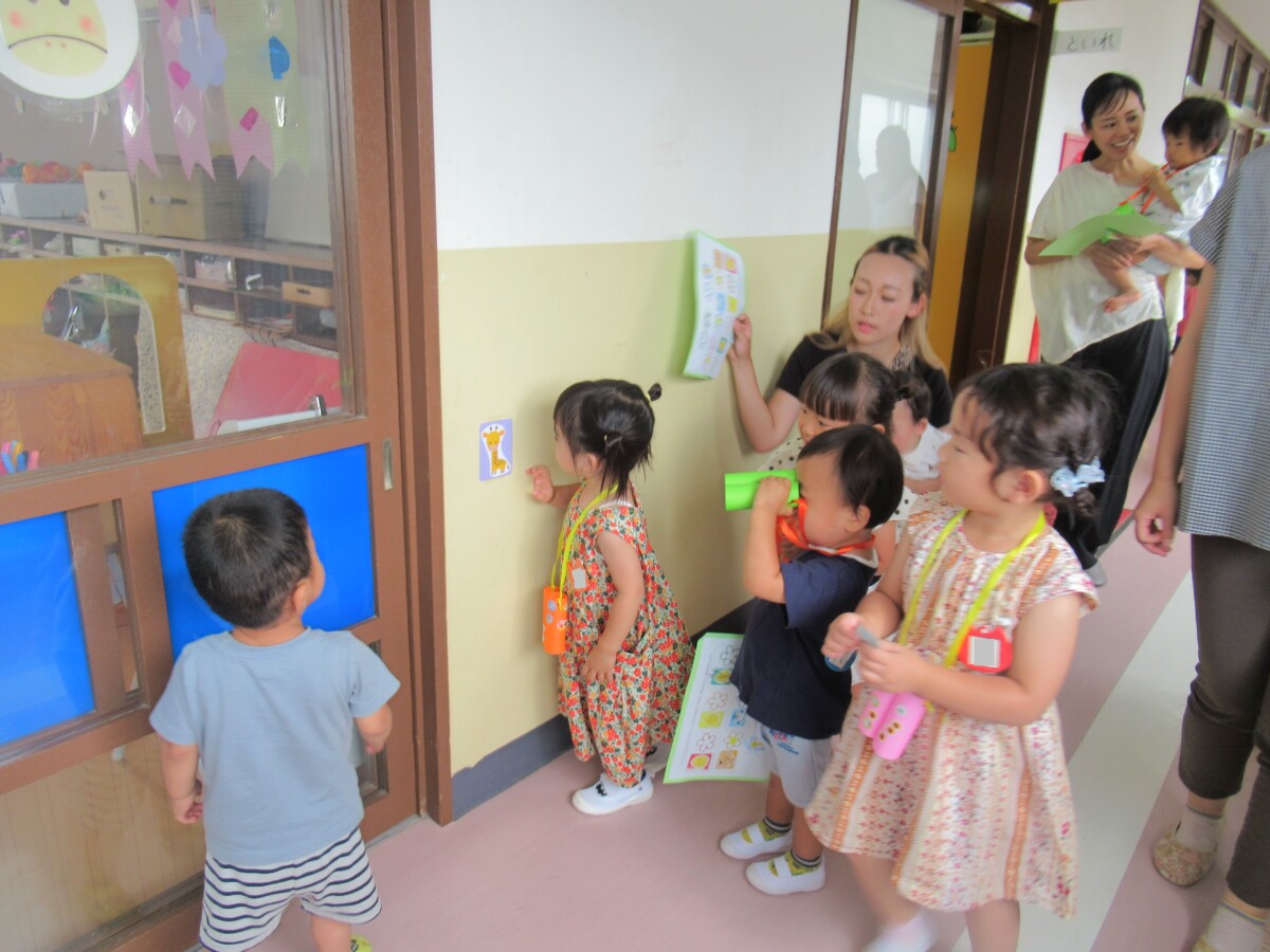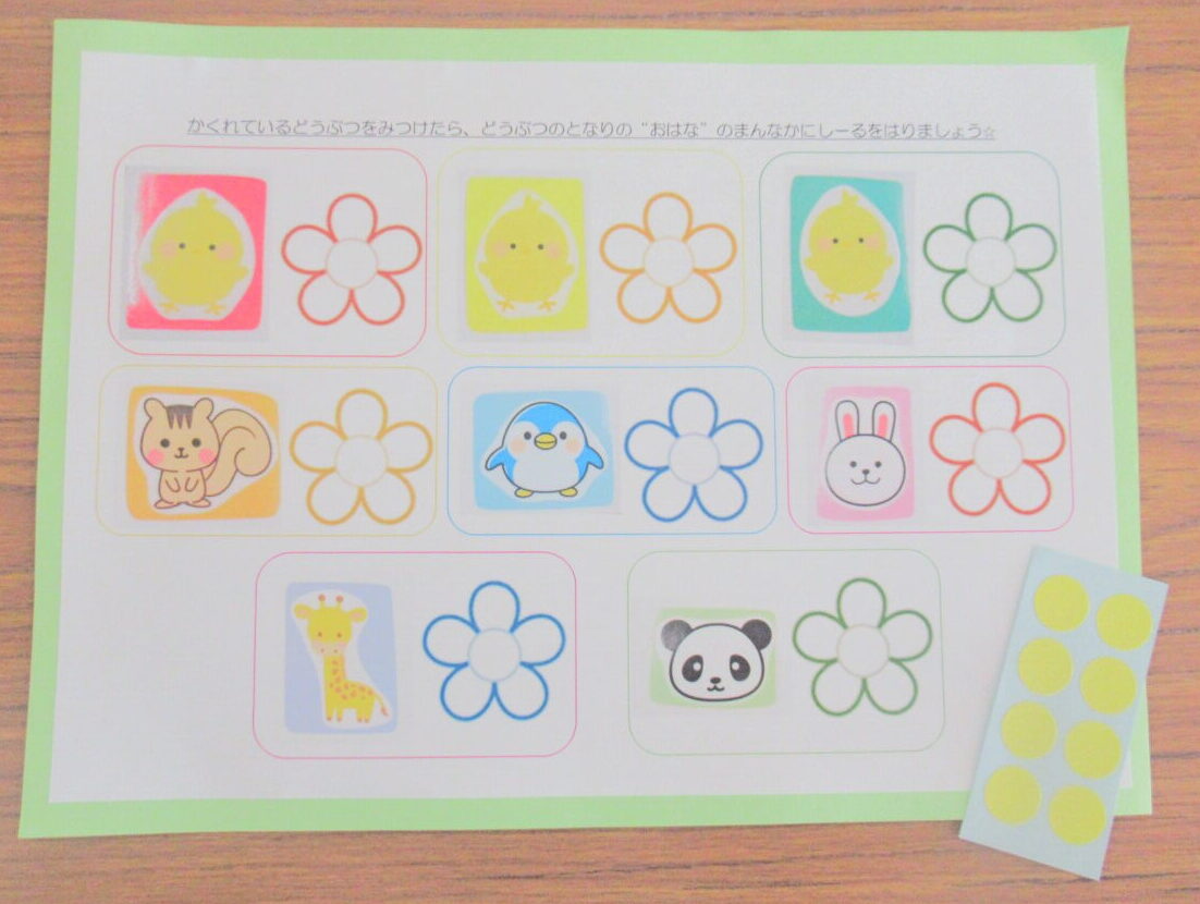 ☆探検の途中で、画用紙に書かれている動物を見つけ、見つけた動物の隣のお花にシールを貼りました🎵