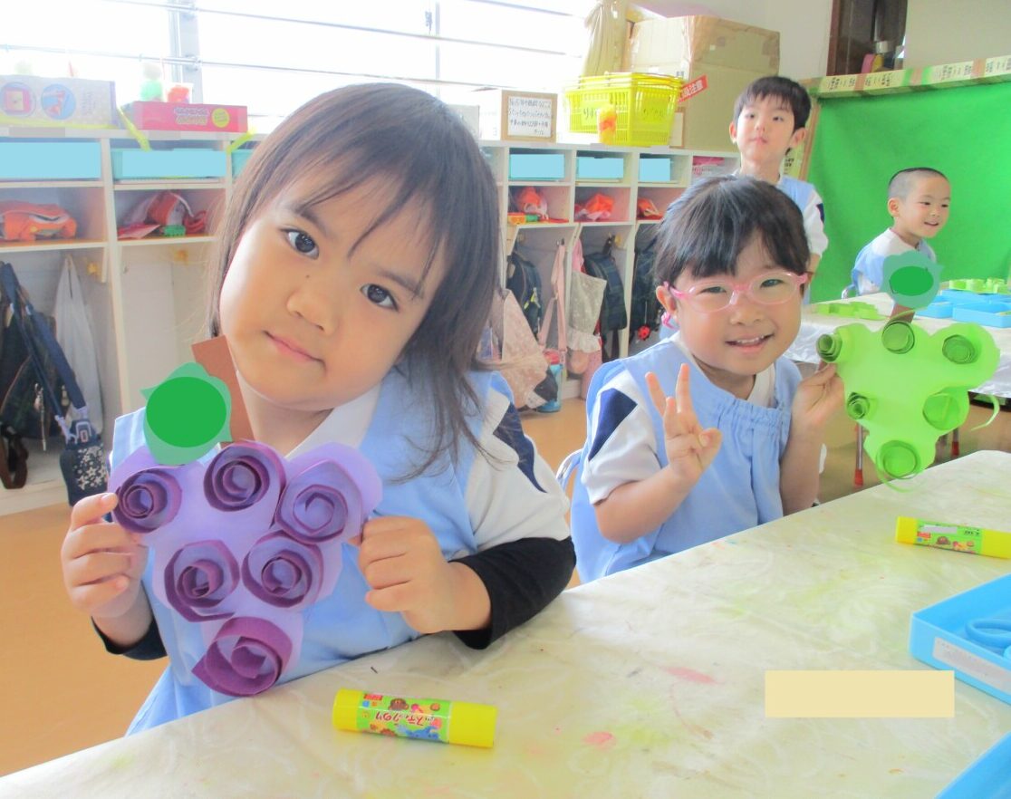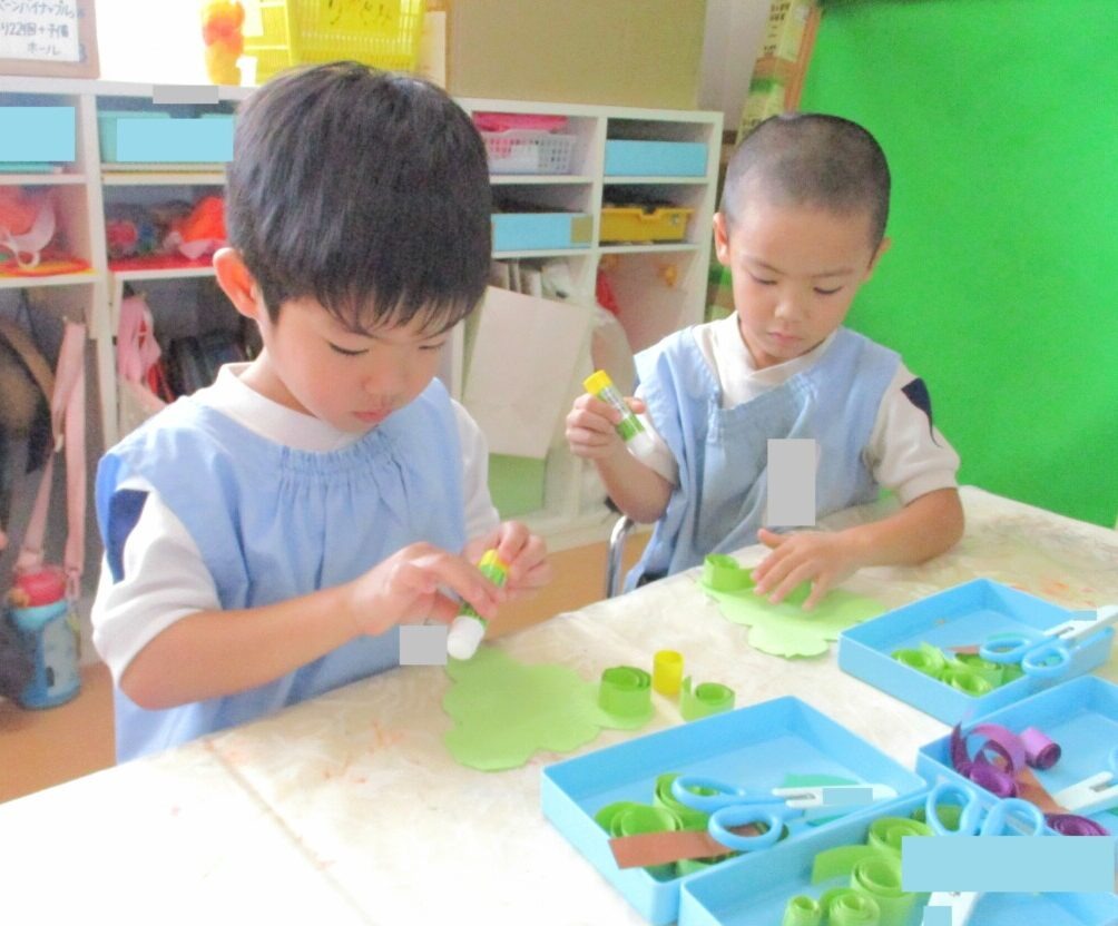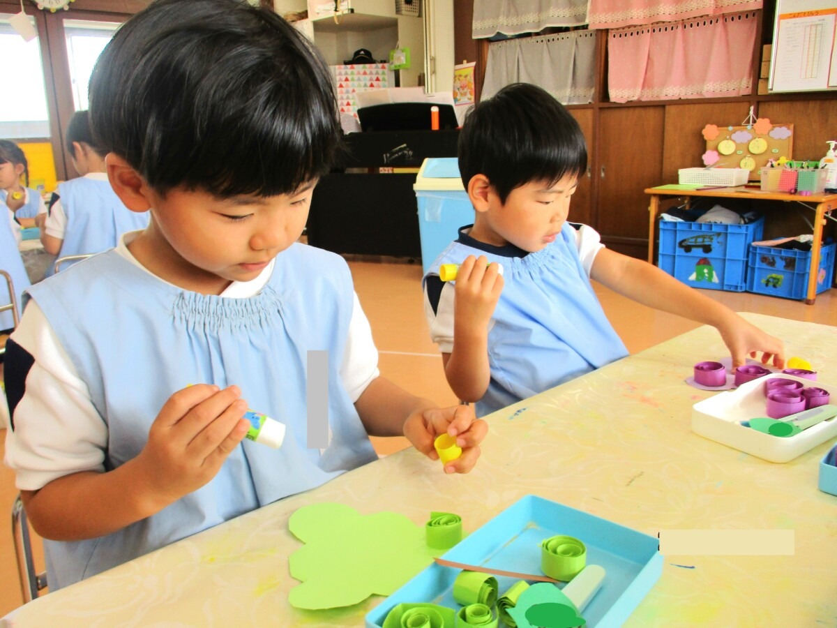 ☆丸めた画用紙をぶどうまたはマスカットの形に切った画用紙にのりで貼っていました🎵