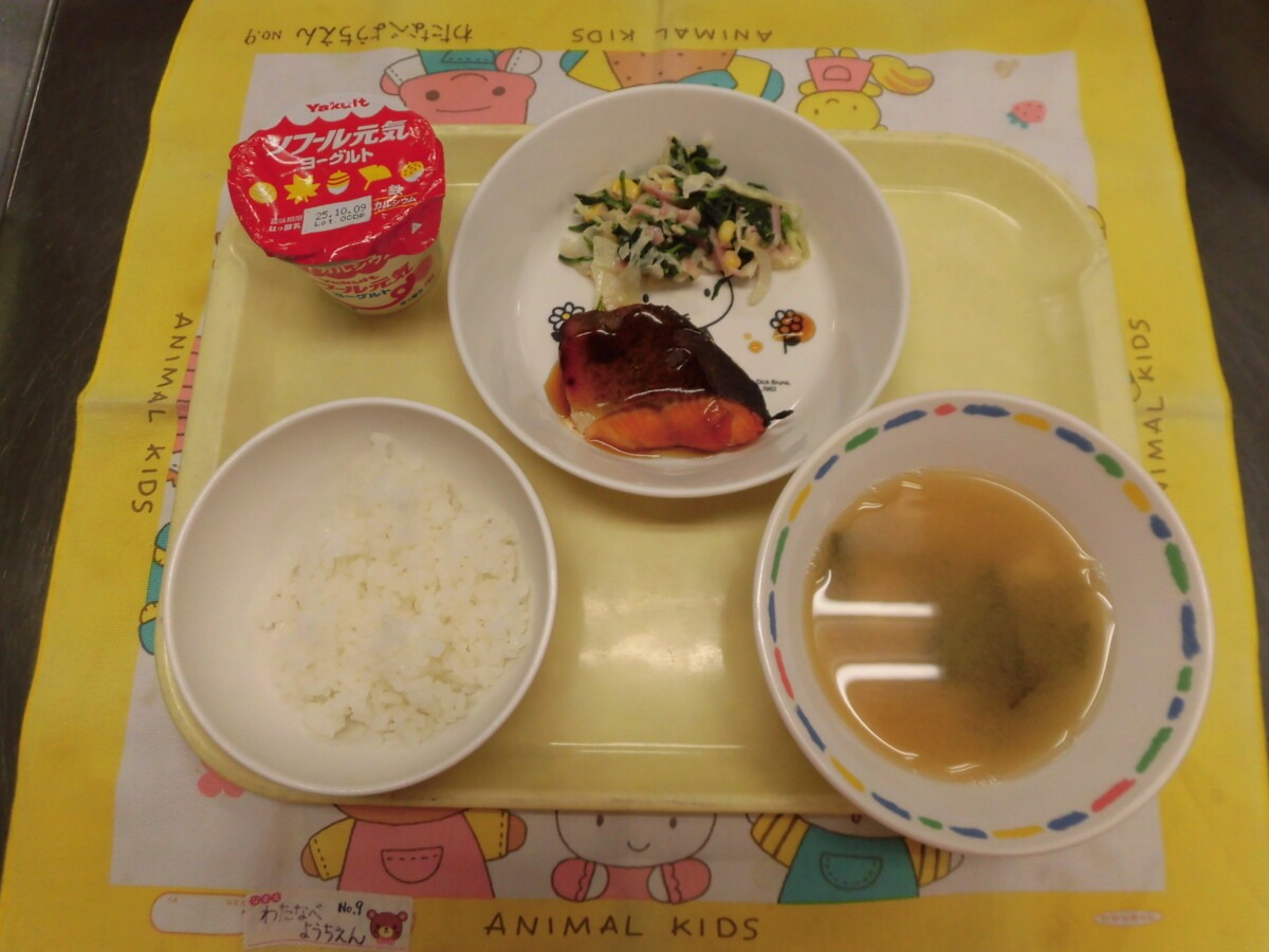9月25日(木)ご飯・鮭の照り焼き・ベーコンとほうれん草のサラダ・えのきとわかめの味噌汁・ヨーグルト