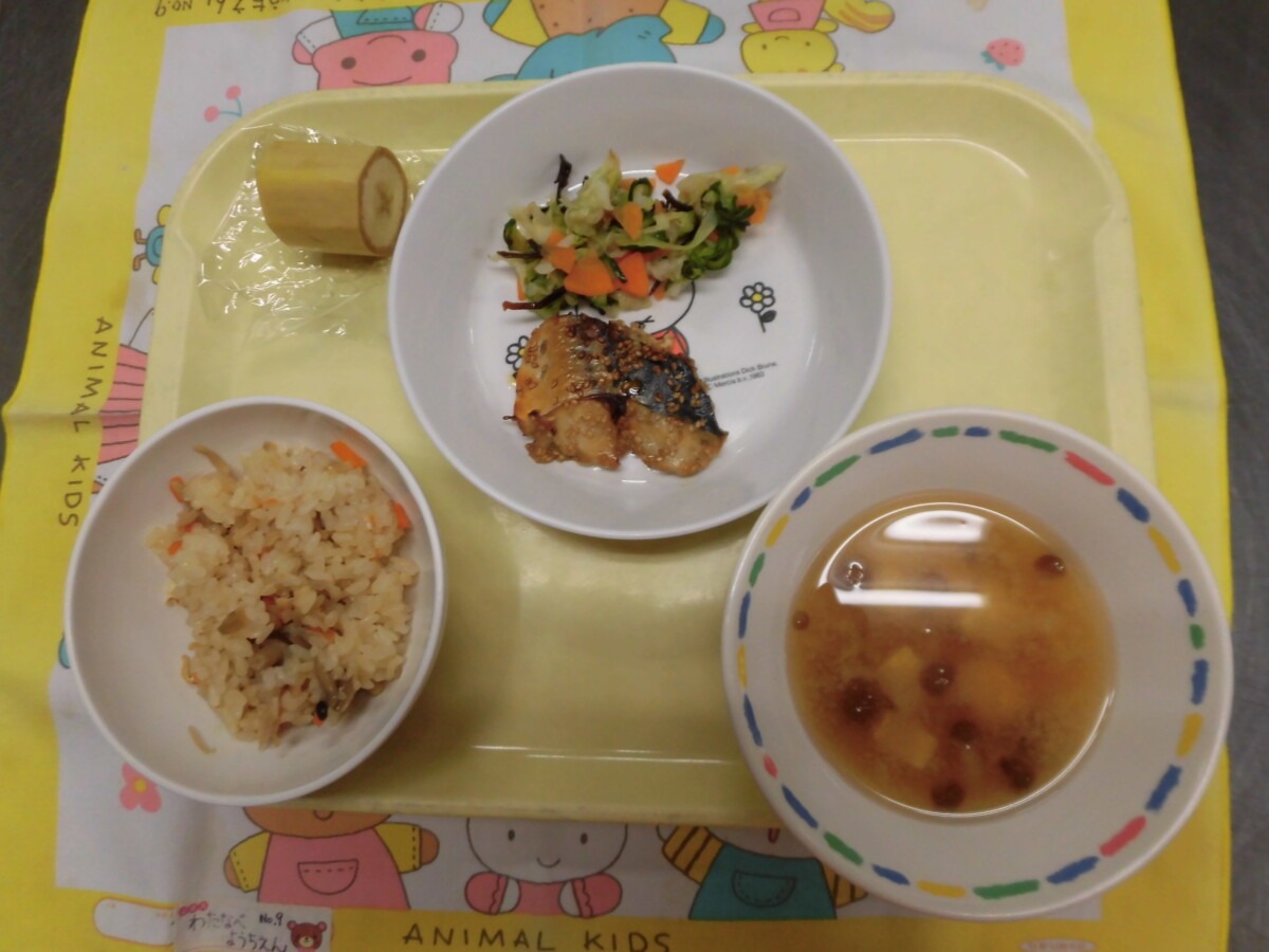 10月16日(木)きのこご飯・さばのごまだれ焼き・野菜の塩昆布和え・なめこと豆腐の味噌汁・バナナ