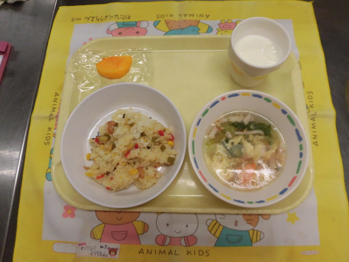 カレーピラフは、ウインナー・ピーマン・赤ピーマン・コーン・たまねぎを入れました。春雨スープは、ベーコン・人参・チンゲン菜・たまご・春雨をたくさん入れました。