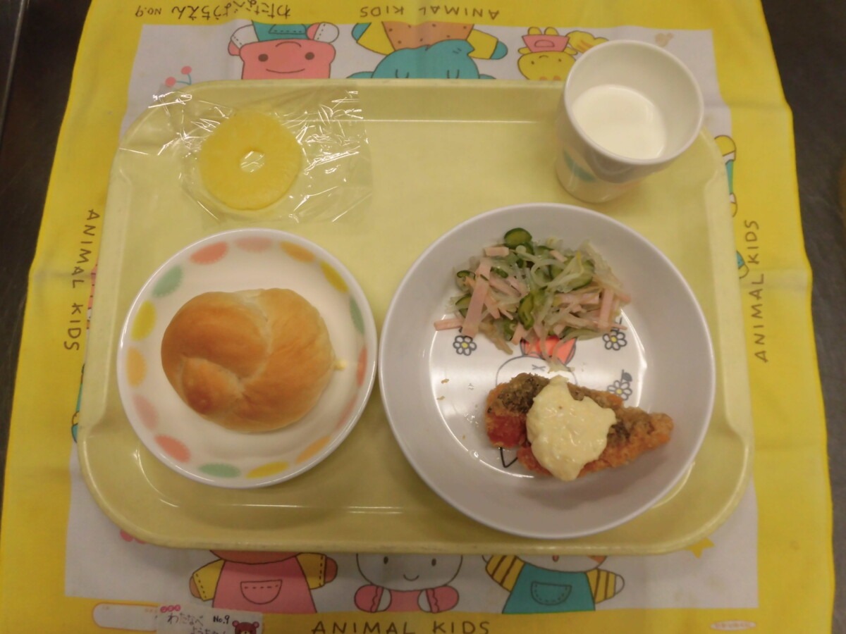 10月28日(火)テーブルロール・鮭フライ(タルタルソース)・バンサンスー・牛乳・パイン缶