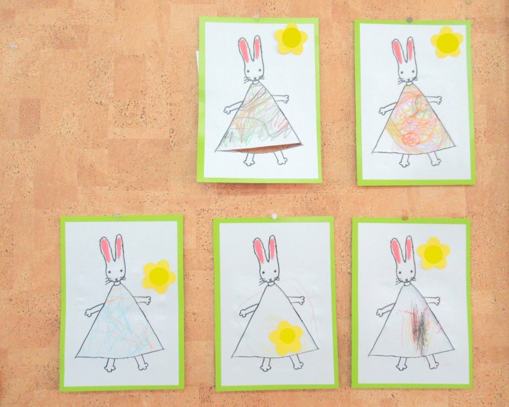 ☆今回は、絵本『わたしのワンピース』のうさぎさんのワンピースをクレヨンで表現しました🎵