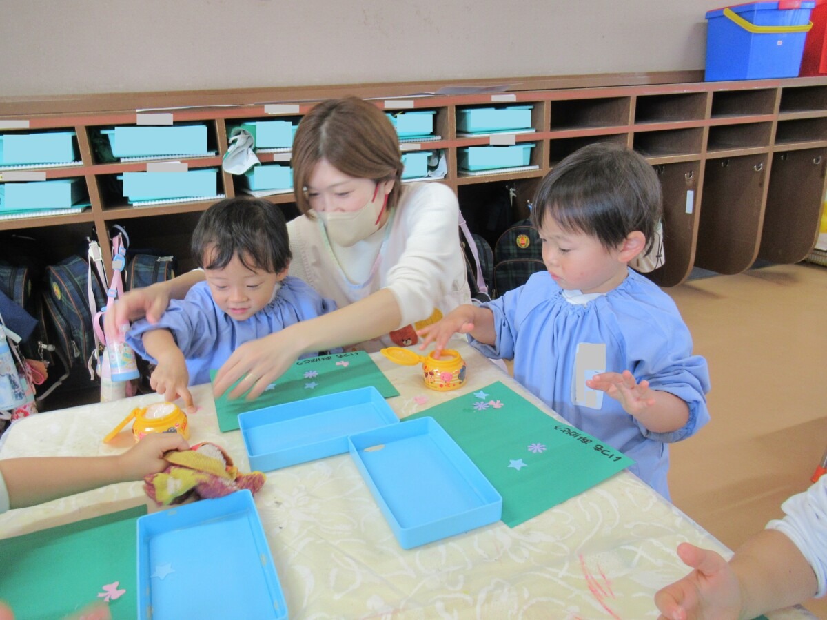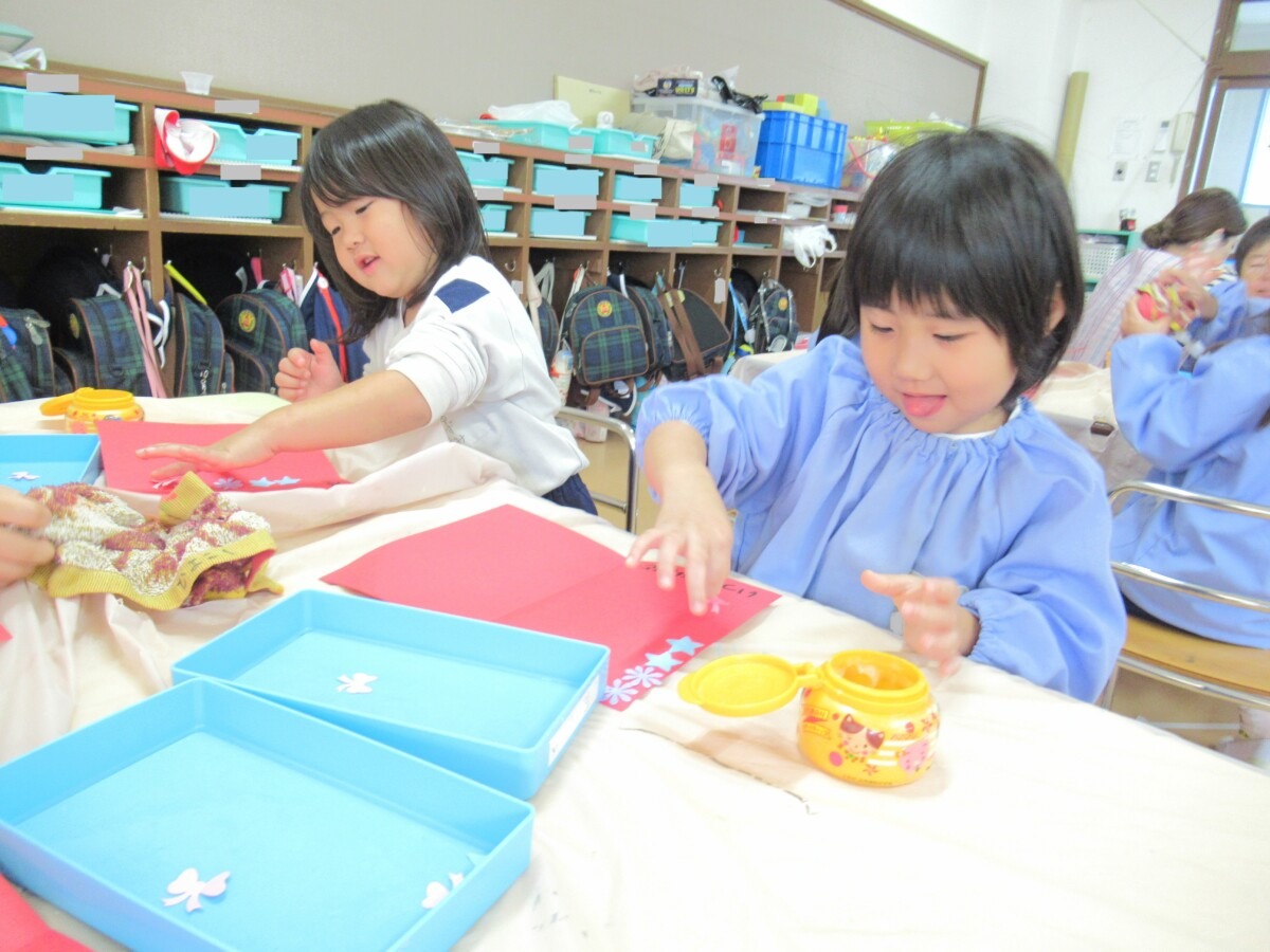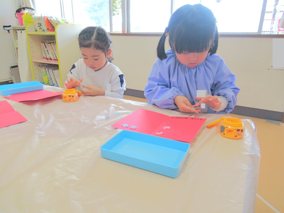 ☆それぞれのクラスカラーの画用紙に、星やリボンの形の飾りをのりで貼っていました🎵