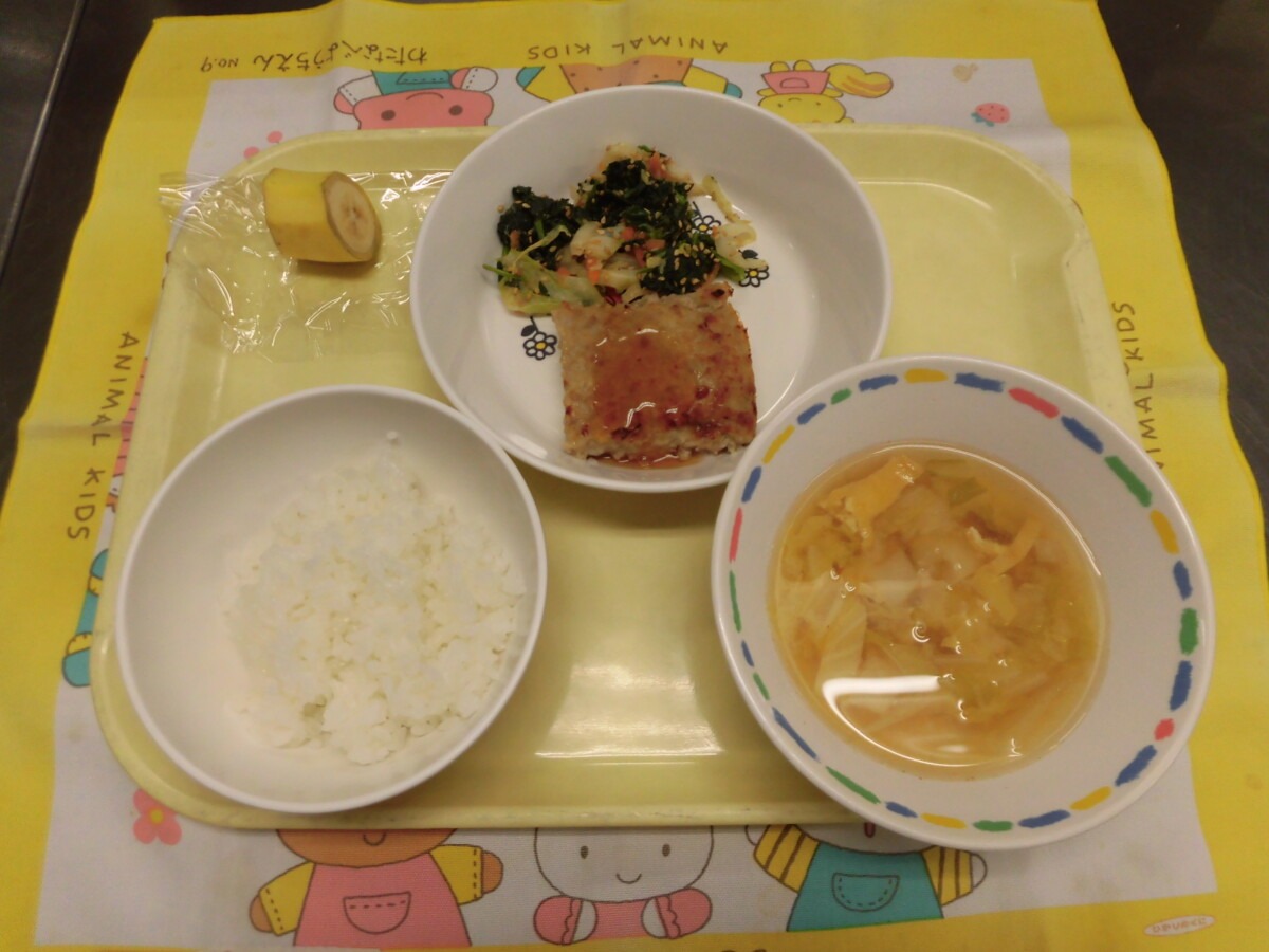 11月14日(金)ご飯・れんこん入りメンチ焼き・ほうれん草と人参の胡麻和え・白菜の味噌汁・ばなな