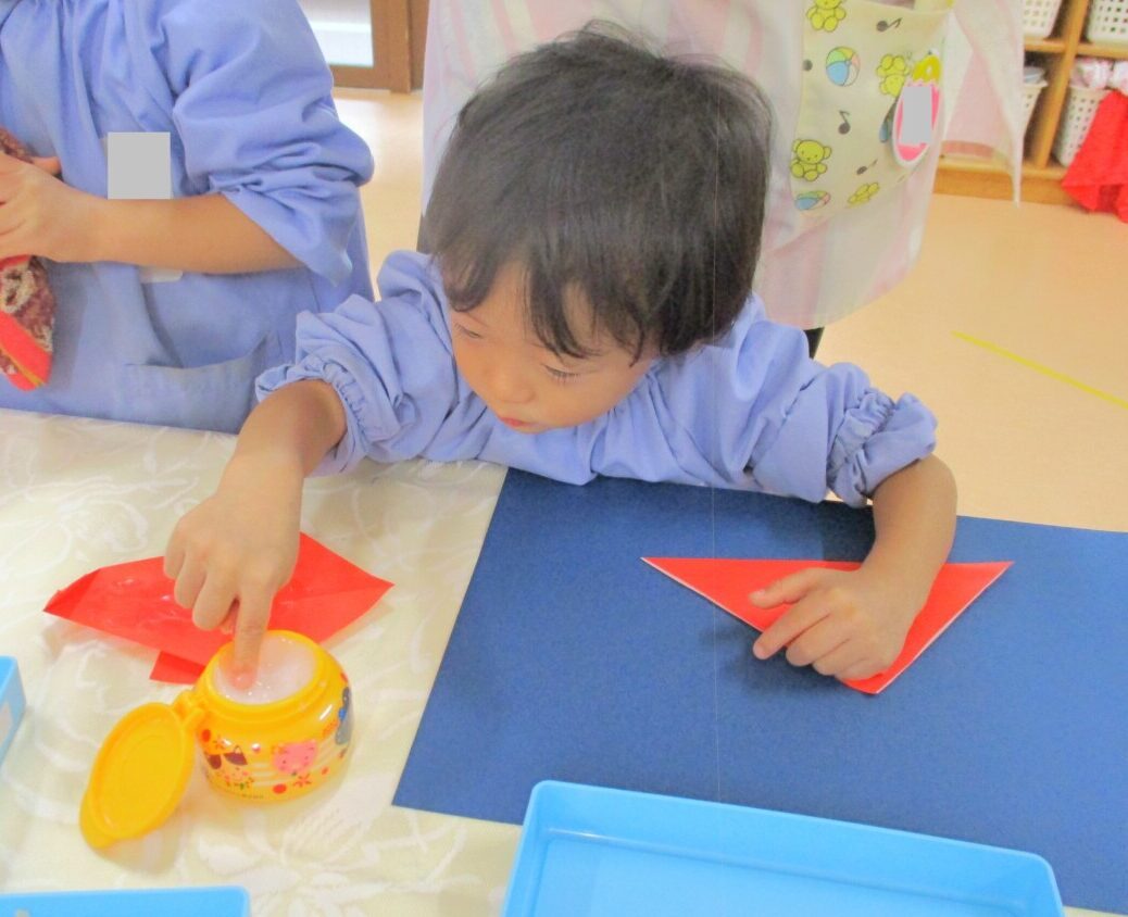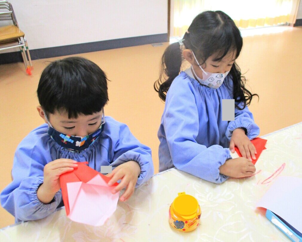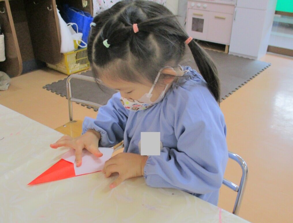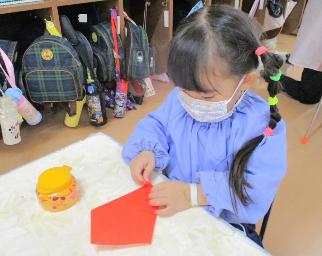 ホーム > 保育 > 11月18日(火) ひよこ3組さん折紙製作☆ 2025/11/18 ひよこ3組さんが、折紙で『サンタさん』の形を折っていました🎅🎵 ☆集中して取り組む姿が見られました🎵 ☆折った折紙は、画用紙にのりで貼っていました🎵 また後日続きに取り組むようです😊!! - 保育