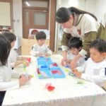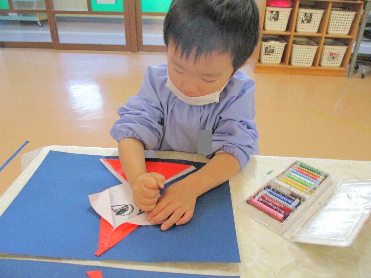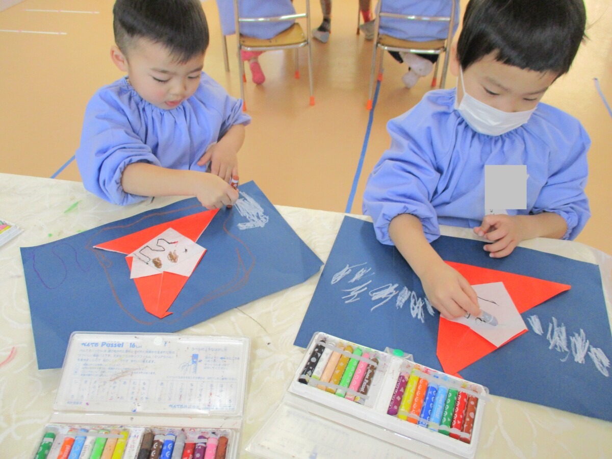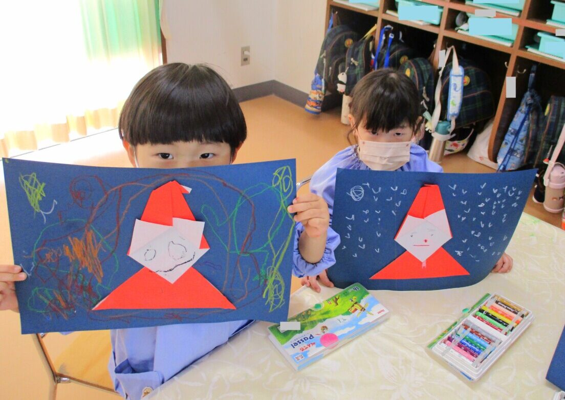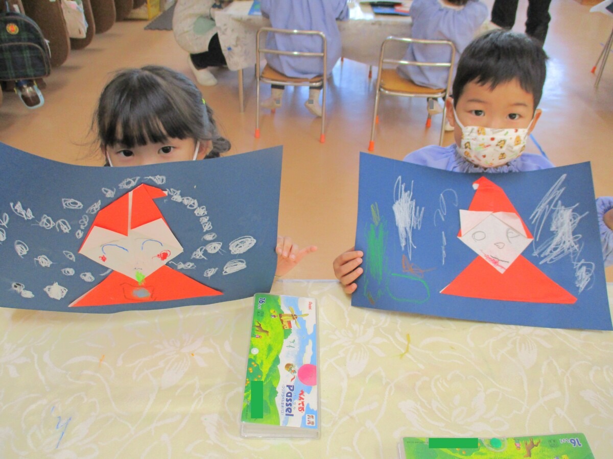 ホーム > 保育 > 11月19日(水) ひよこ3組さん折紙製作続き☆ 2025/11/20 ひよこ3組さんが、11月18日(火)の折紙製作の続きで、画用紙に貼ったサンタさんの折紙に、クレヨンで自由に絵を描いていました🎅✨ ☆とってもかわいらしい作品ができていました😊🎵 - 保育