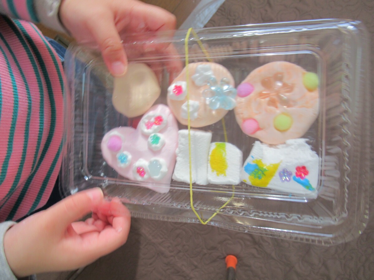 ☆きいろ、ぴんく、水色、オレンジの絵の具を白い粘土に自由に塗ってこね、好きな形を作ったり、磁石をつけて作品を作りました🎵