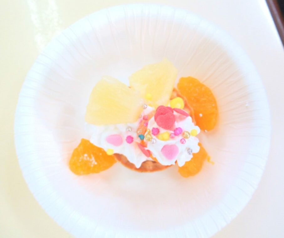 ☆タルトの生地に、生クリームをのせ、みかんとパイナップルの缶詰、星やハートなどのカラーシュガーを自由にトッピングして、素敵な『タルト』ができました✨