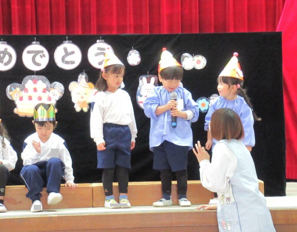 ☆お誕生日のお友だちが舞台にあがり、一人ひとりクラスと名前を発表しました!!