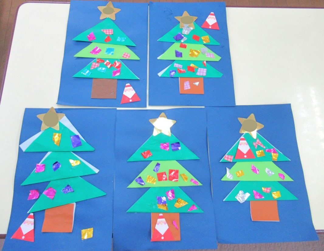 ☆はさみで切った飾りをのりで折紙のクリスマスツリーに貼り、素敵な作品ができました✨