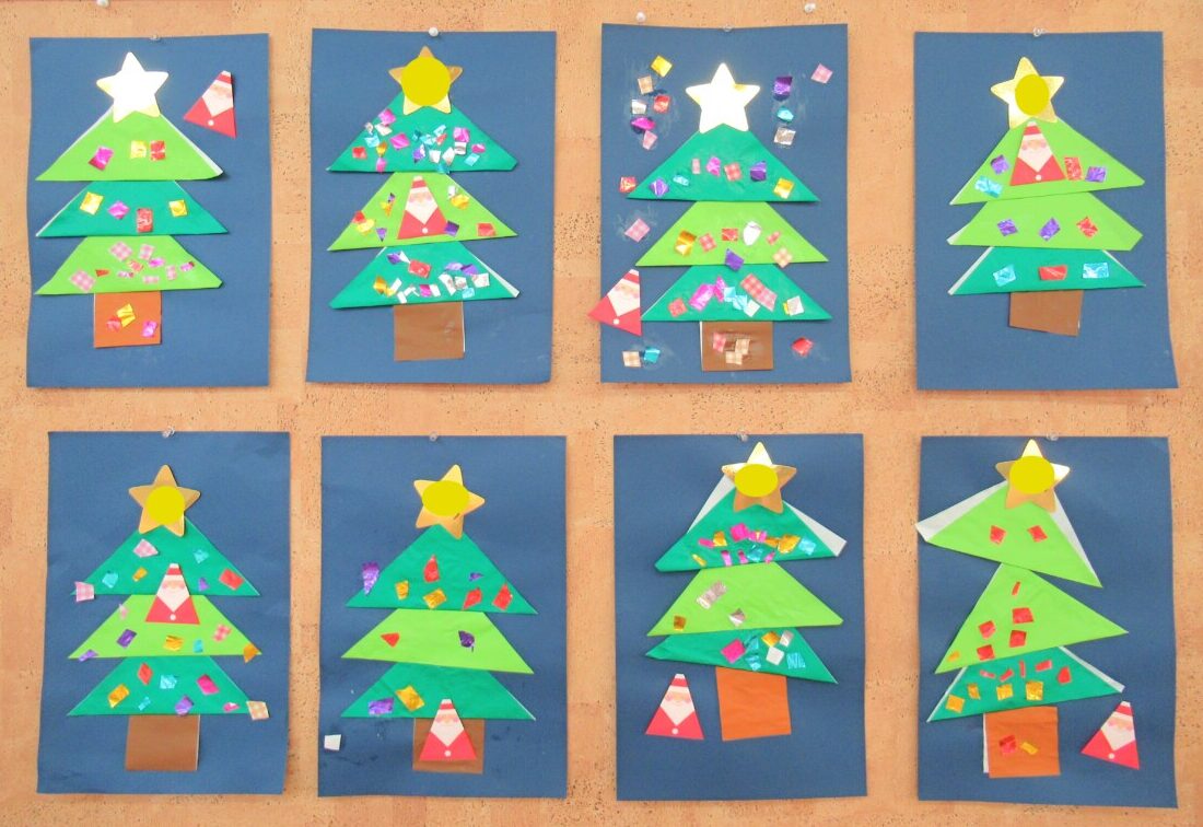☆はさみで切った飾りをのりで折紙のクリスマスツリーに貼り、素敵な作品ができました✨
