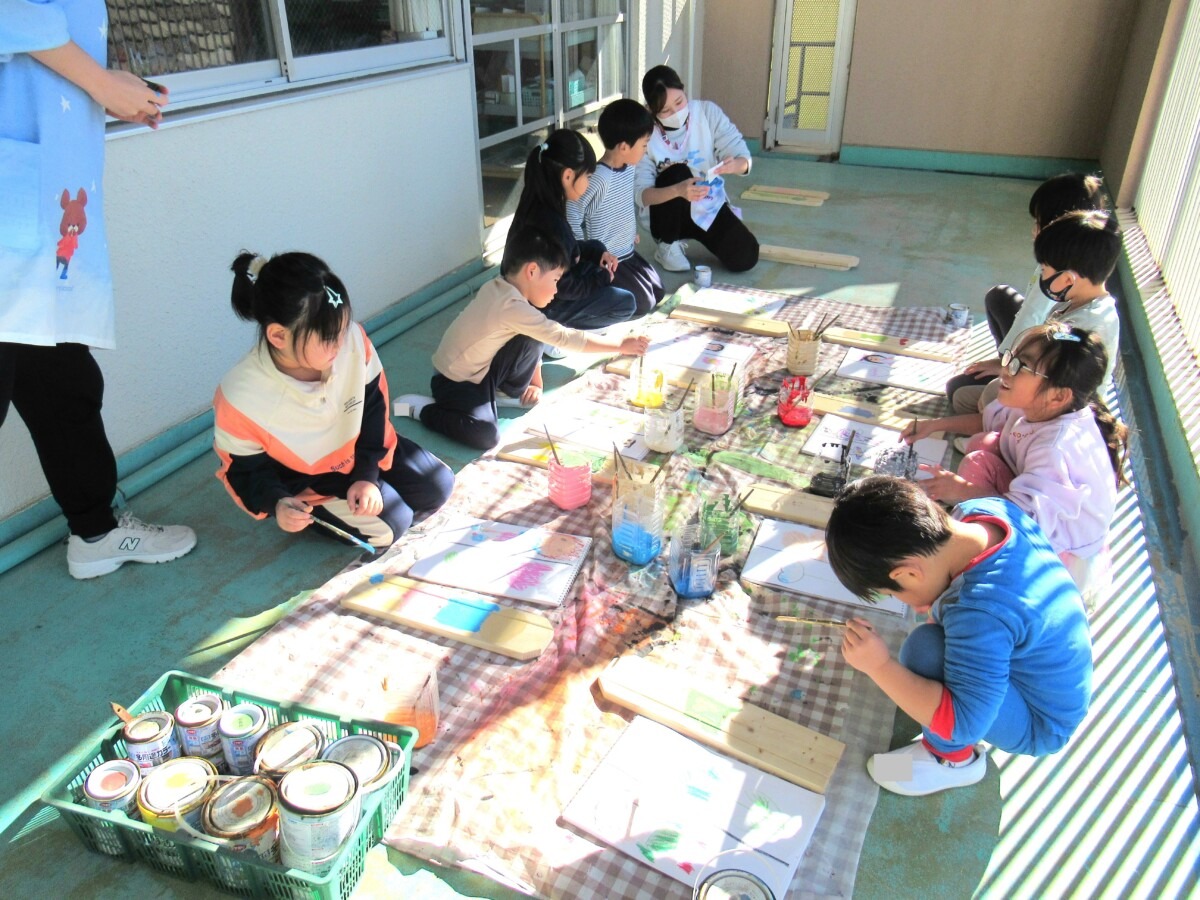 ☆年長組さんは、卒園製作に取り組んでいて、一人ずつ自画像とお花の2作品を木に描いていました✨