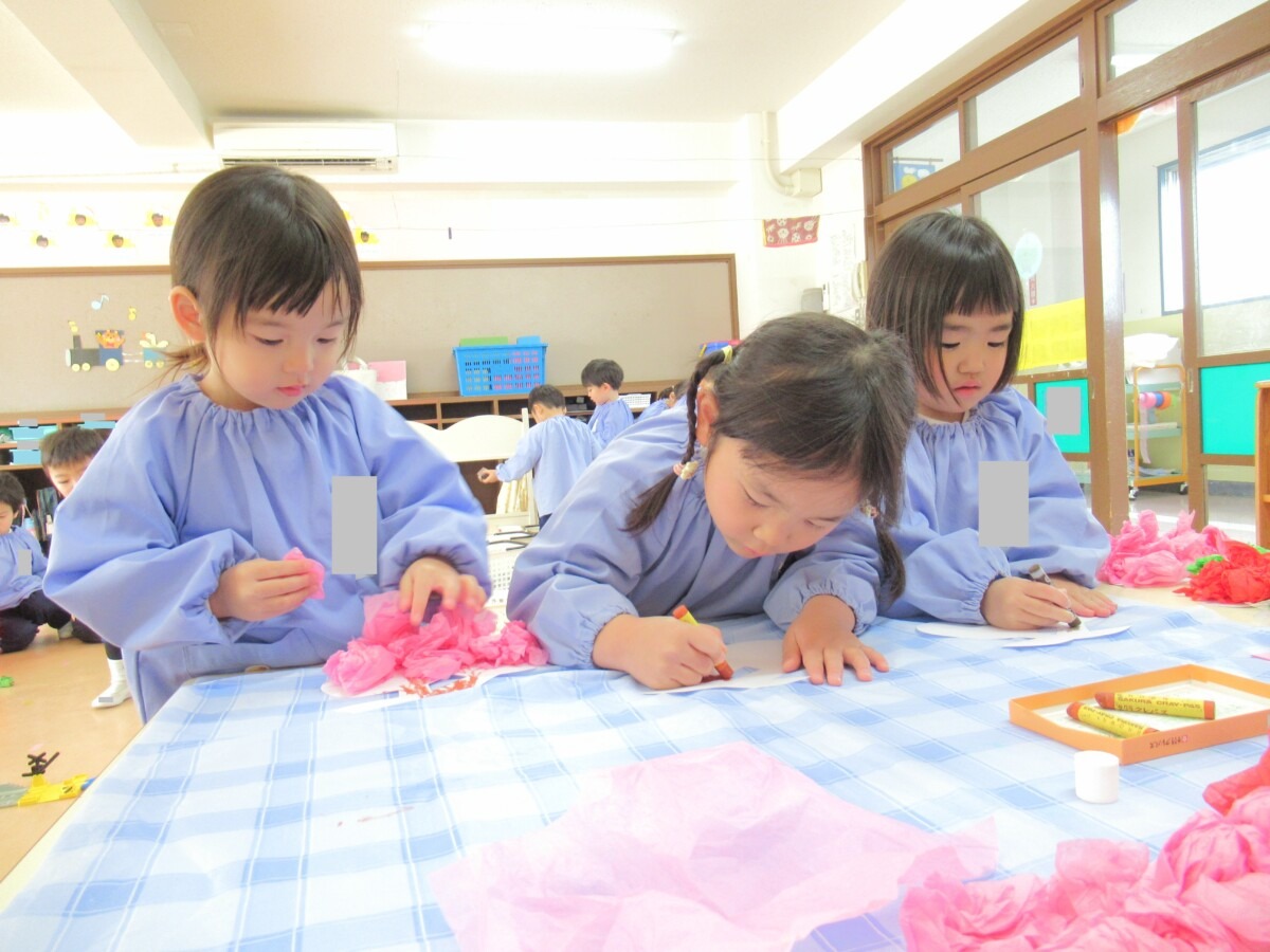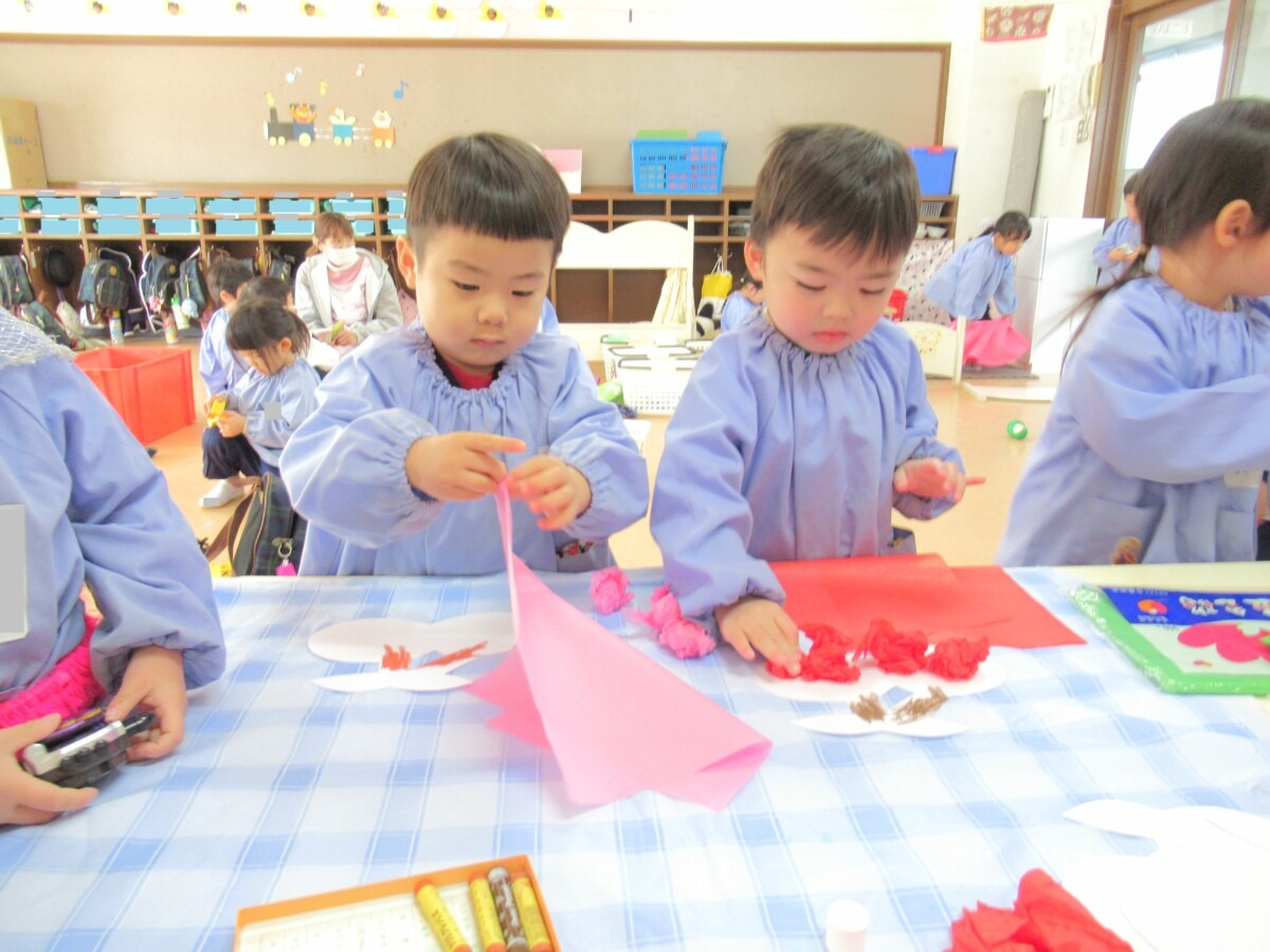 ☆ひよこ3組さんの満3歳のお友だちが、発表会のお遊戯のときに身に付ける『さくらんぼ』の製作に取り組んでいました🍒💛