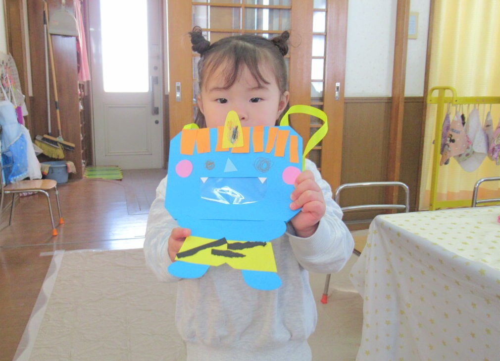 ☆クレヨンで目などを自由に描き、かわいい個性豊かな”鬼”ができました😊💛