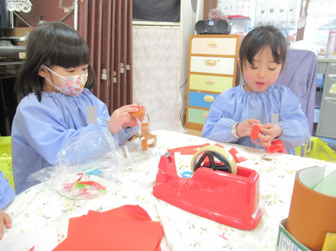 ☆折紙をはさみで細く切り、輪繋ぎを作っているお友だちもいました😊✨