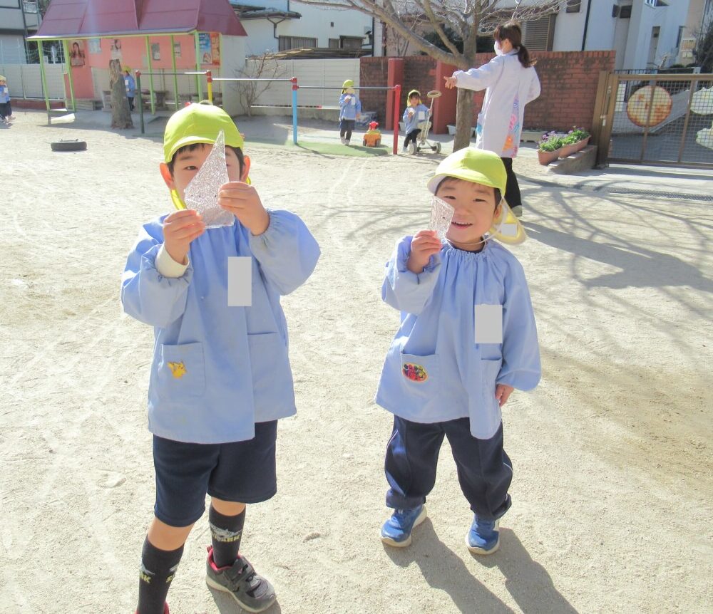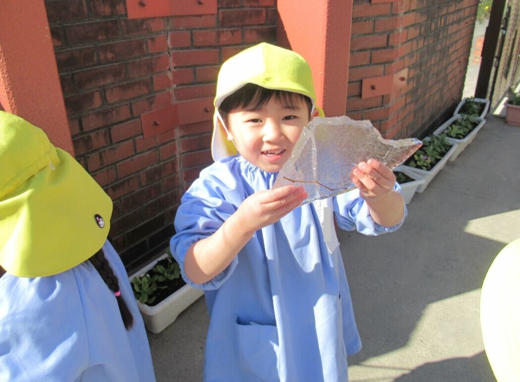 ☆園庭で水が凍って氷になっている場所があるのを先生とお友だちが発見し、子どもたちは『大きな氷があった😊✨』ととても嬉しそうにクラスのお友だちに知らせていました🎵