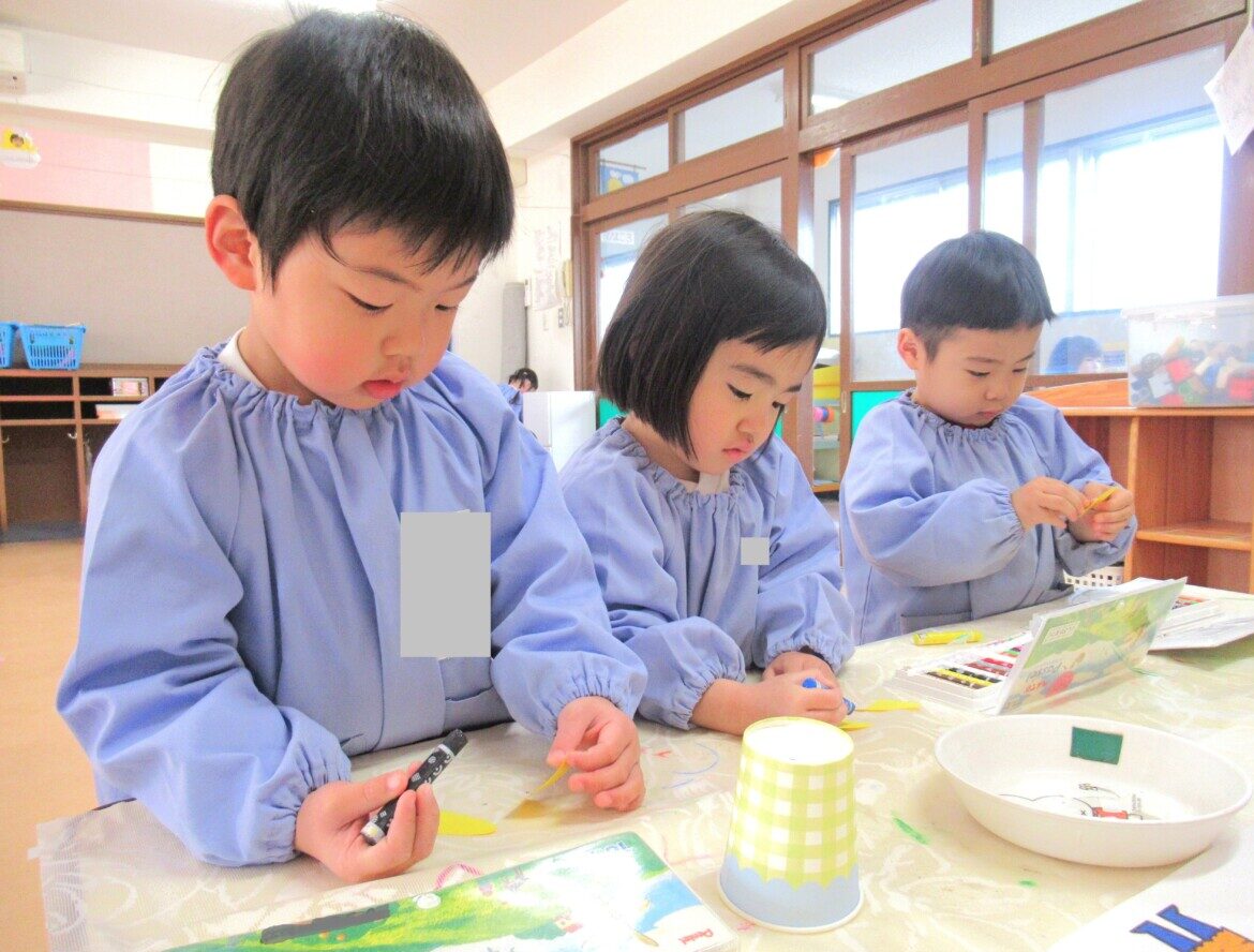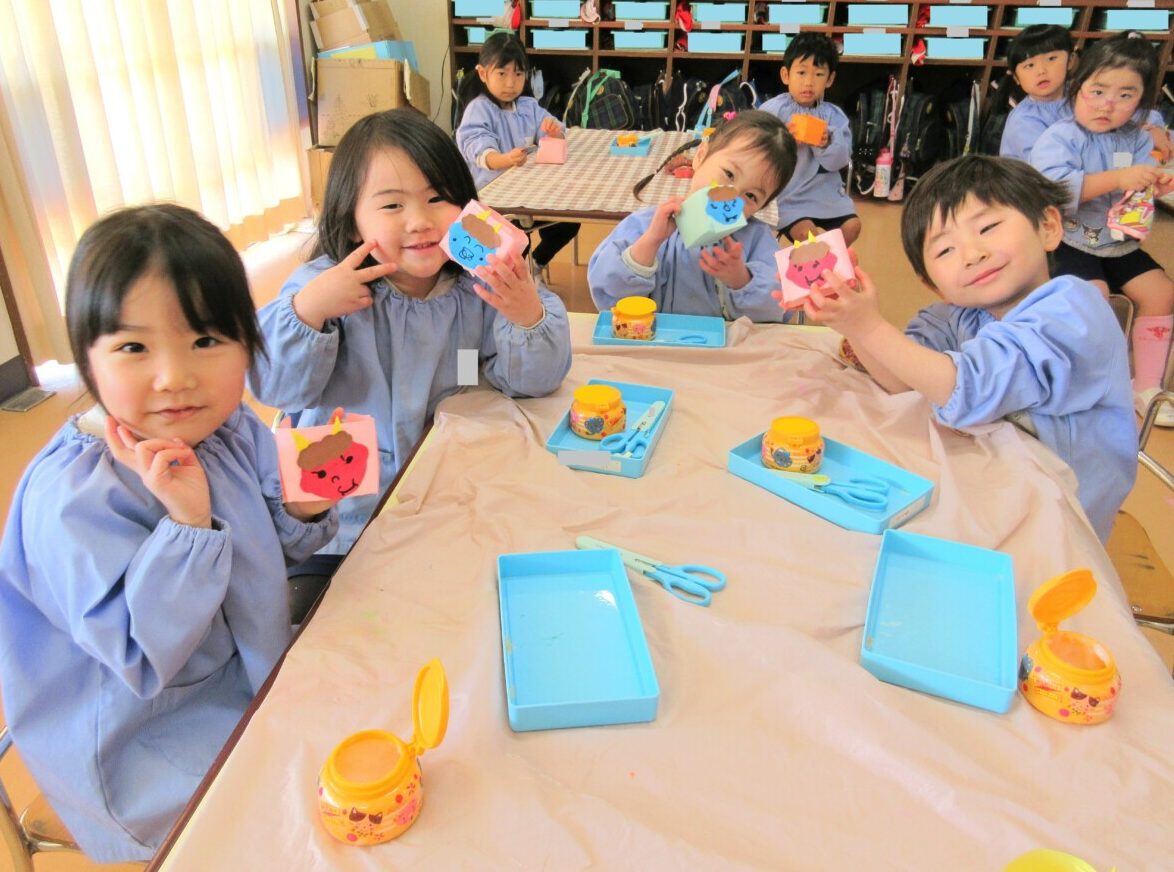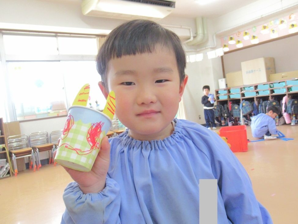 1月27日(火)に、ひよこ1組さん・ひよこ3組さんのお友だちが2月3日の節分に向けて豆入れの製作に取り組んでいました👹🎵