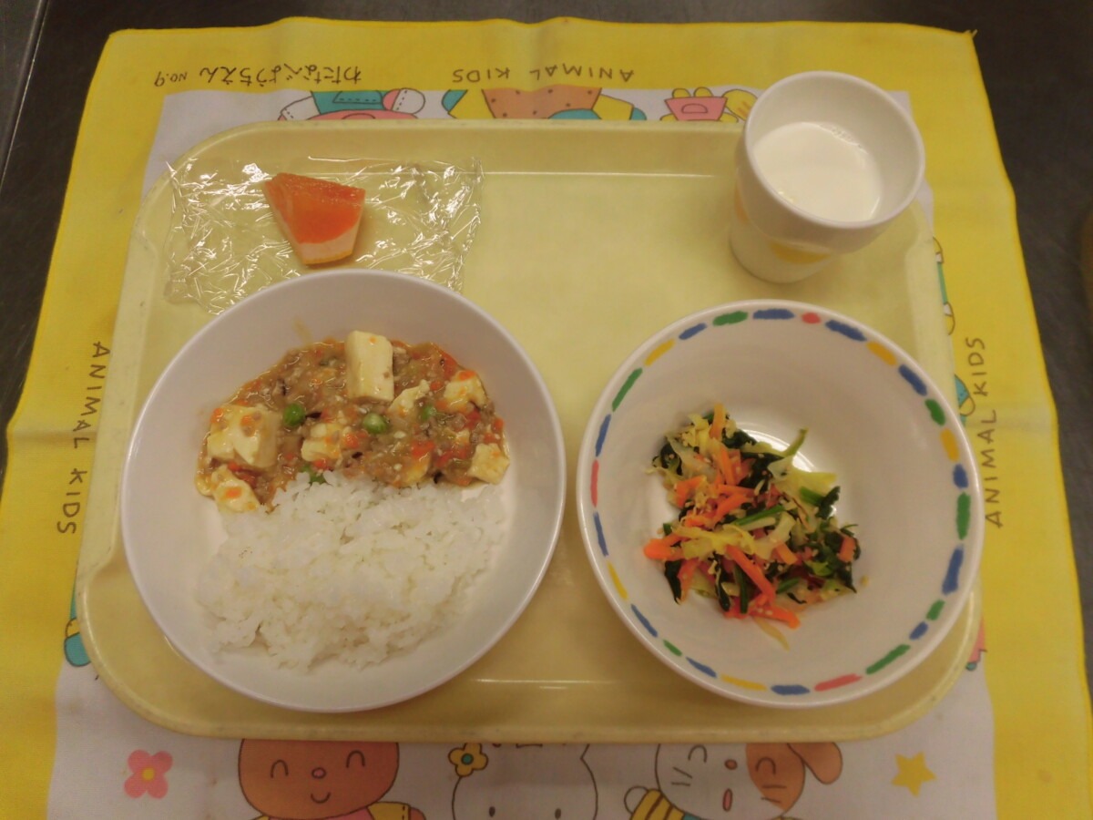 1月26日(月)ご飯・マーボー豆腐・キャベツとほうれん草ナムル・牛乳・グレープフルーツ