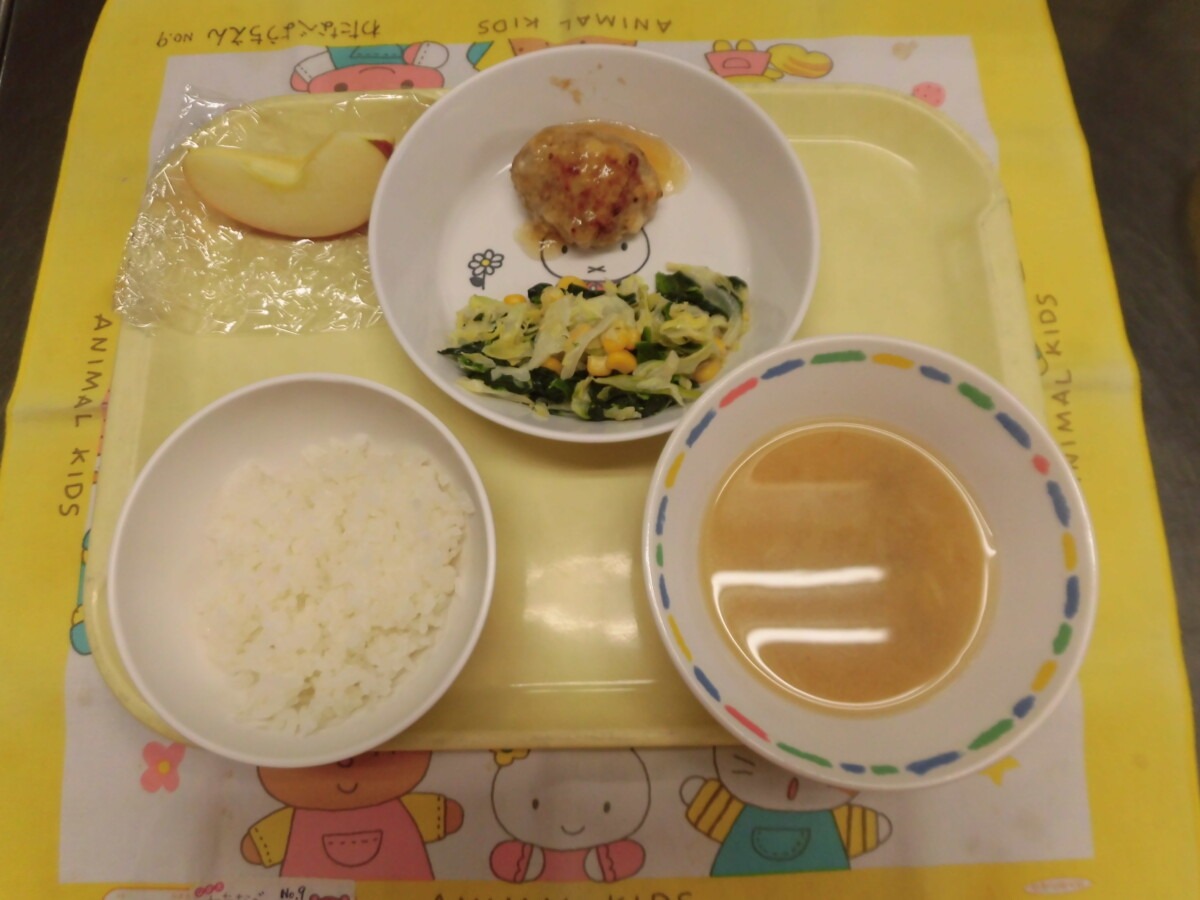 1月27日(火)ご飯・豆腐ハンバーグ(おろしソース)・野菜のマヨネーズ和え・なめこの味噌汁・りんご