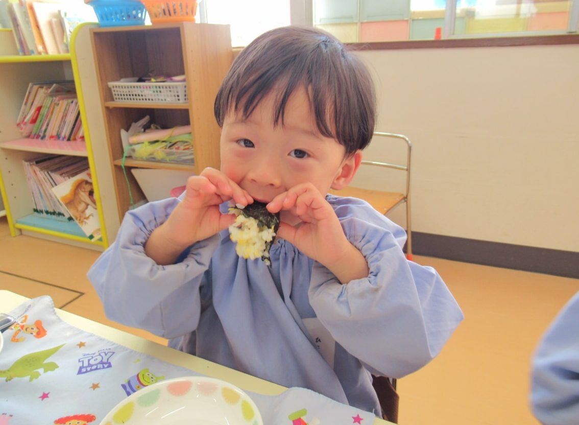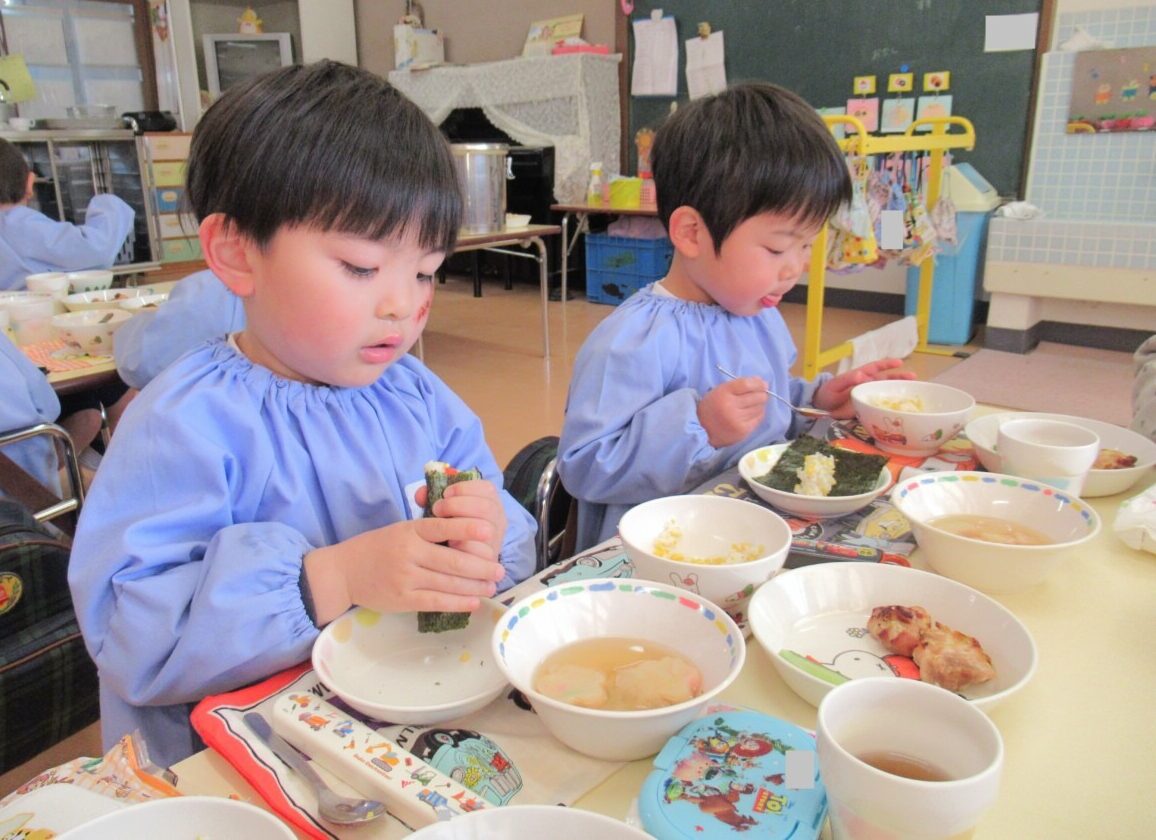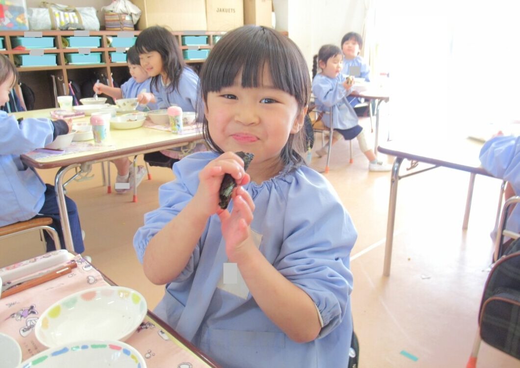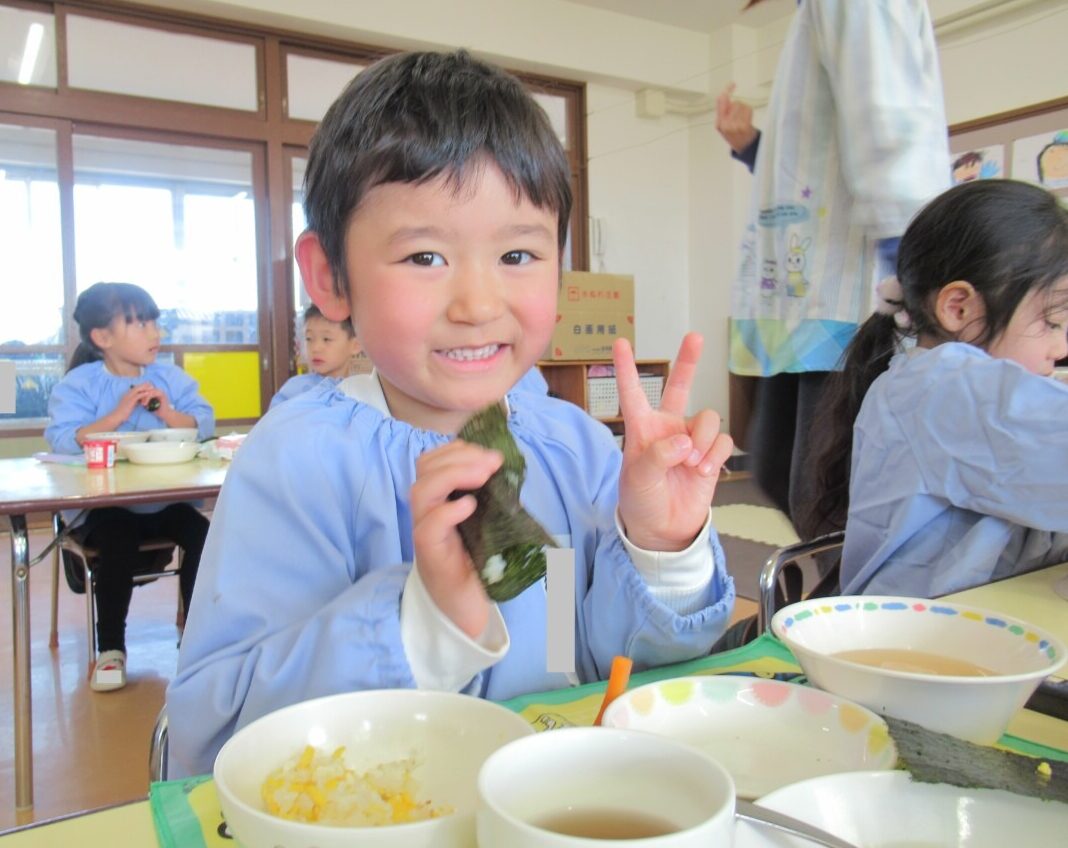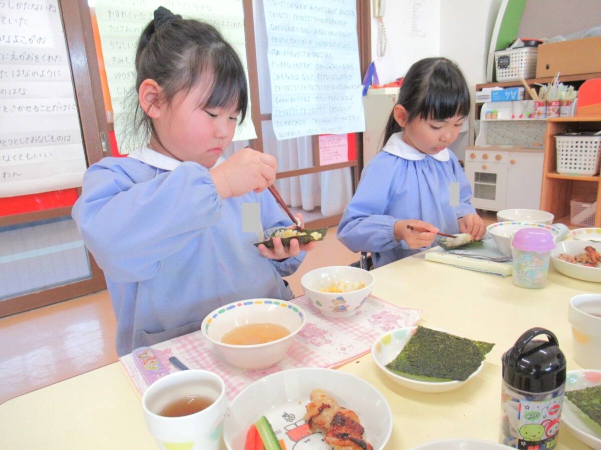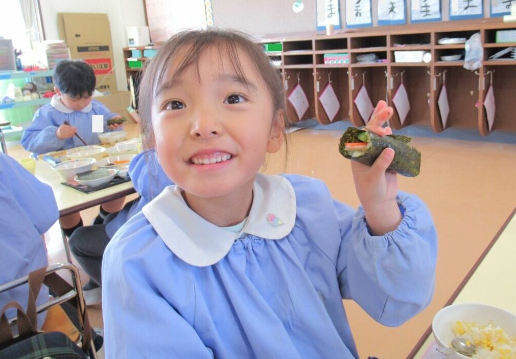 ホーム > 保育 > 2月3日(火) 節分給食☆ 2026/02/03 2月3日(火)の節分の日の給食で、自分で作る『恵方巻』の提供がありました👹🎵 ☆海苔にご飯と具材を乗せて、巻きました✨ ☆『恵方巻を上手に作れたよ😊🎵』 ☆自分で作った恵方巻を嬉しそうに味わっていました😊✨ - 保育