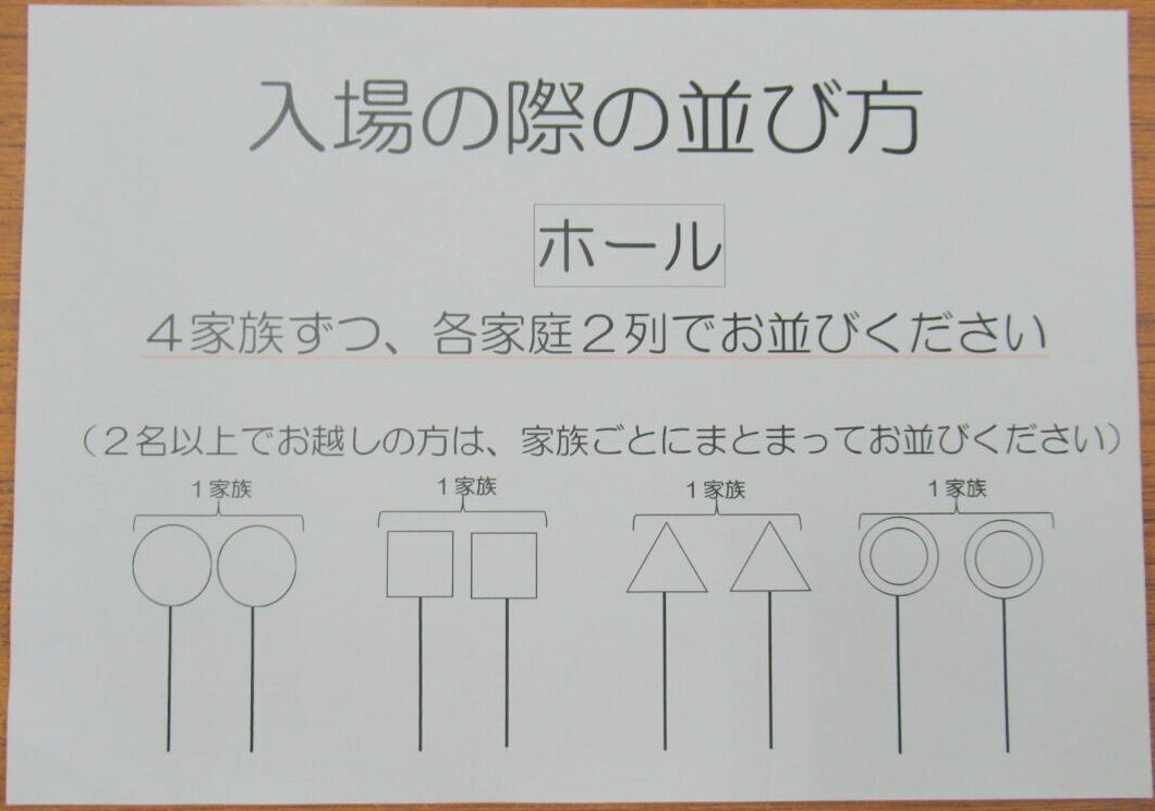 ホール内は大変狭くご不便をお掛けしますが、保護者の方同士で譲り合って入退場をしていただきますよう、ご協力をお願いいたします。