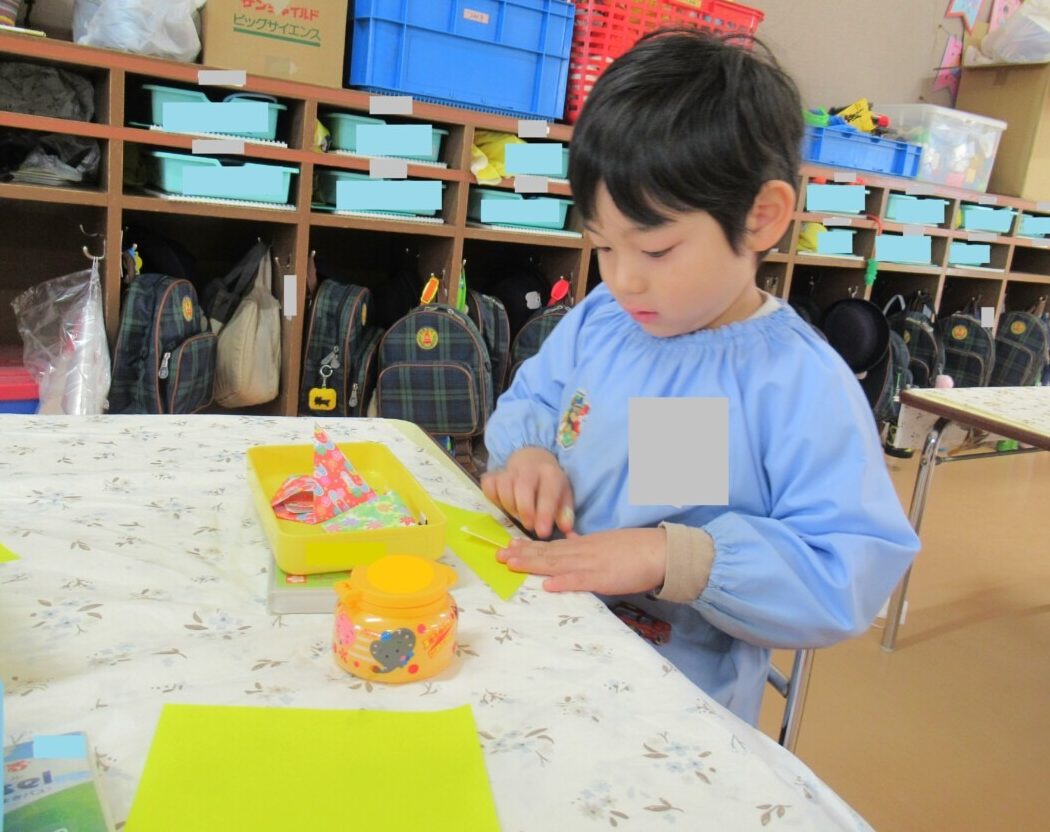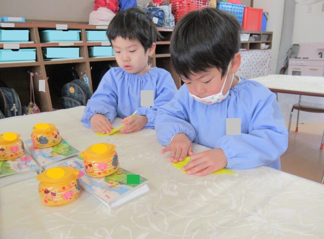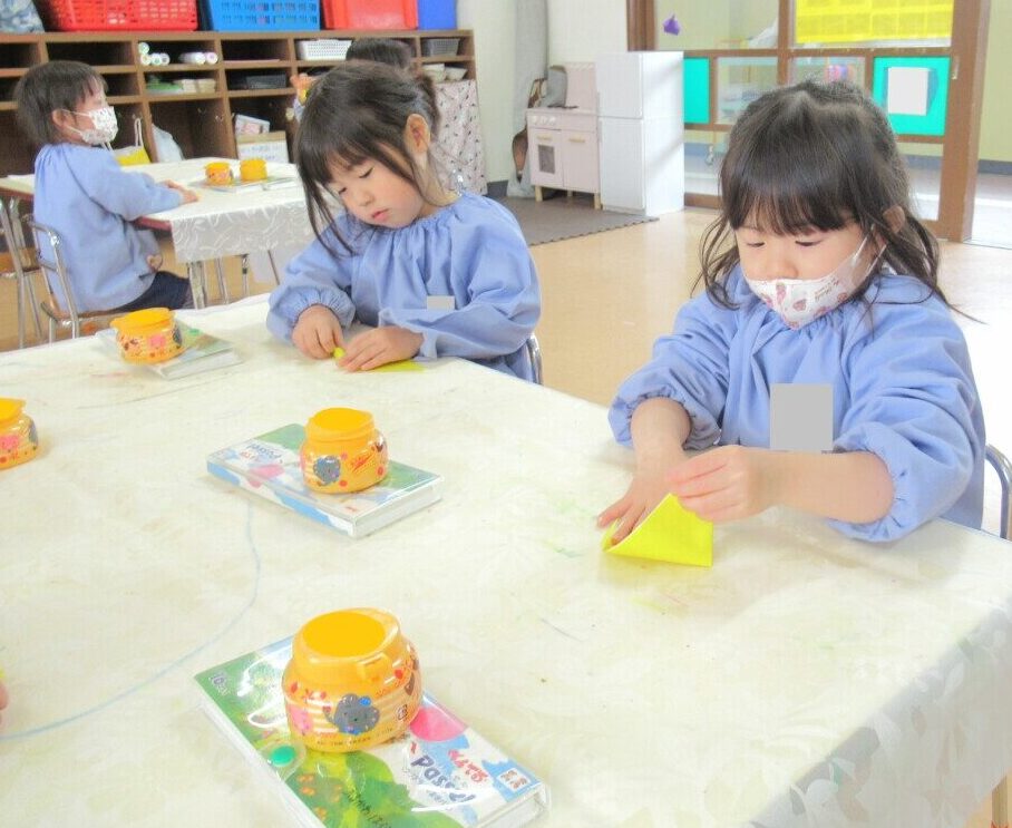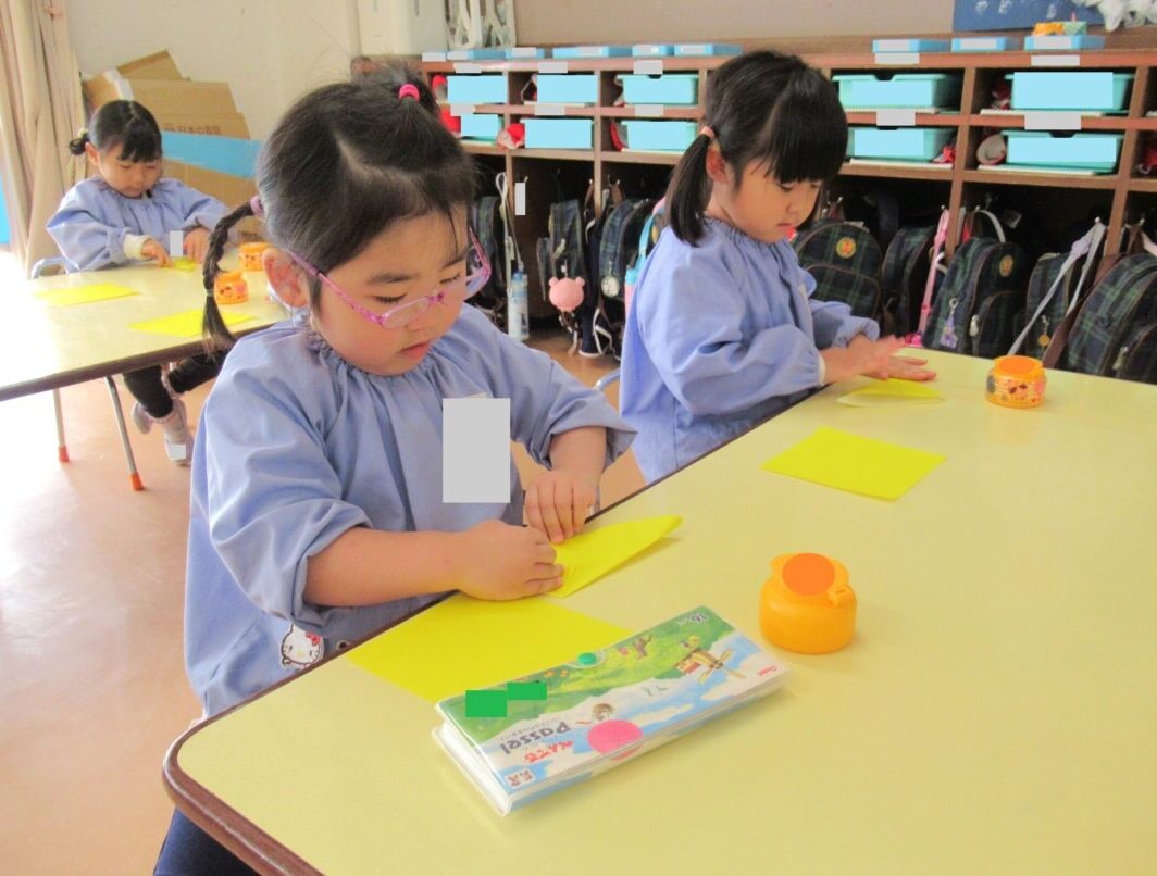 年少組さんのお兄さんお姉さんは、折紙製作でひよこを折っていました🐤✨