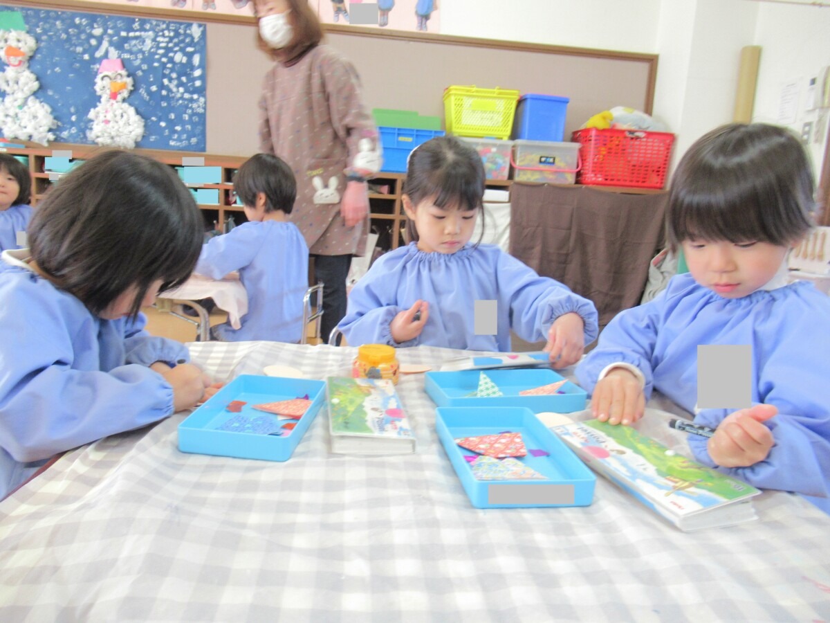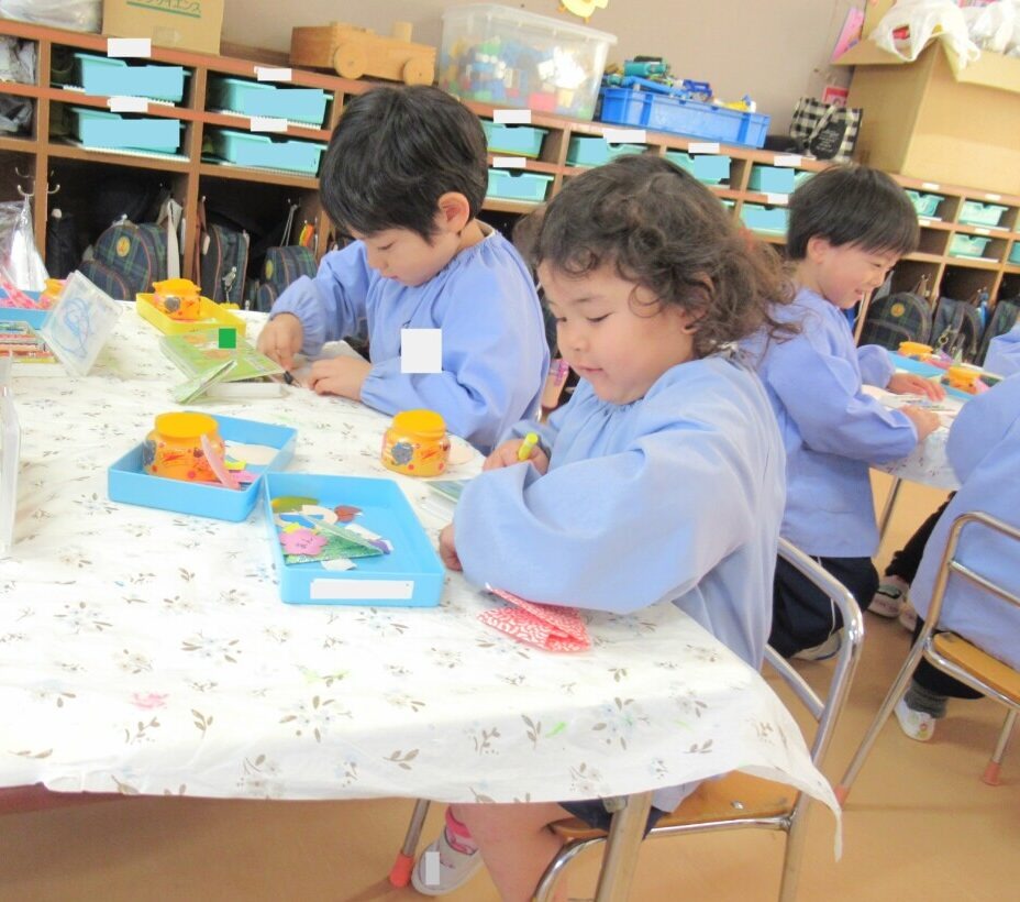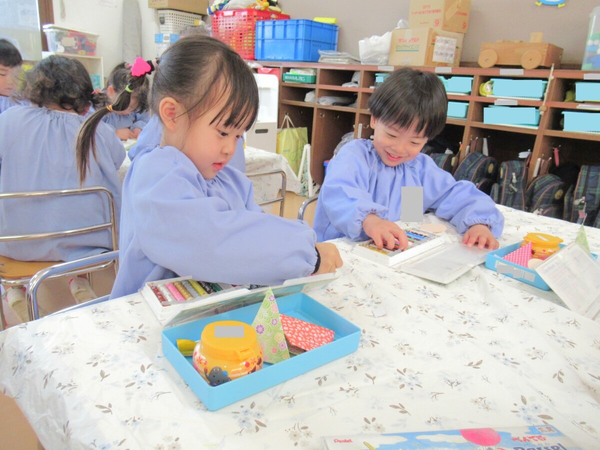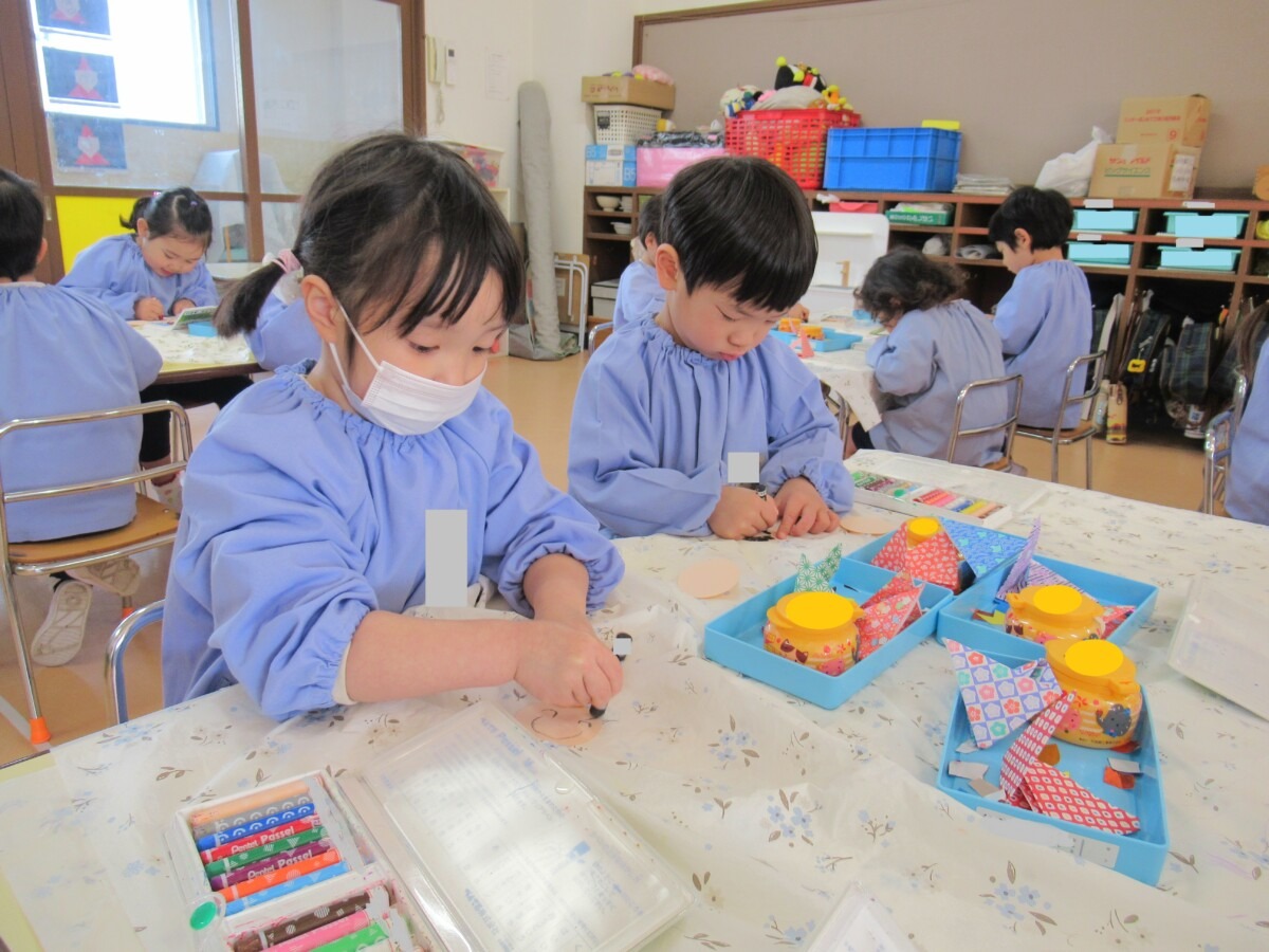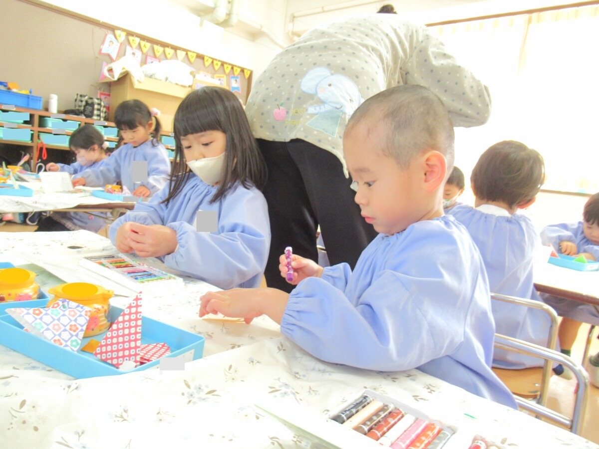 2月17日(火)に、年少組さんが、ひなまつり製作に取り組んでいました🎎✨