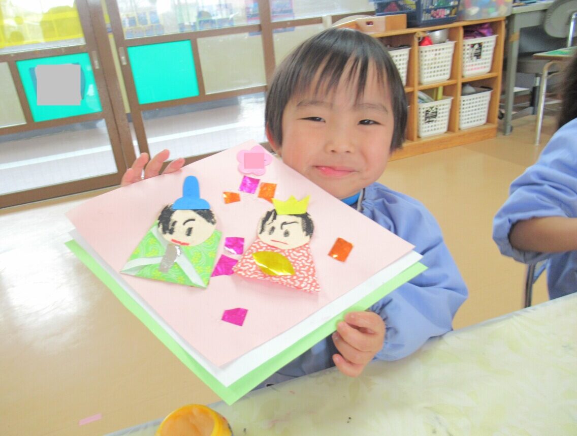 ☆お内裏様とお雛様をひしもちの画用紙に貼り、先日はさみで切ったキラキラの折紙も貼って、すてきな作品ができていました✨