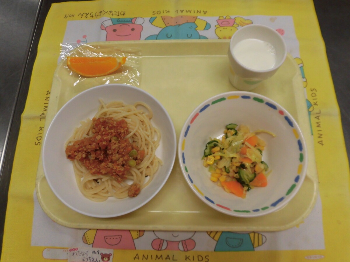 2月16日(月)ミートソーススパゲッティー・コーンサラダ・牛乳・でこぽん