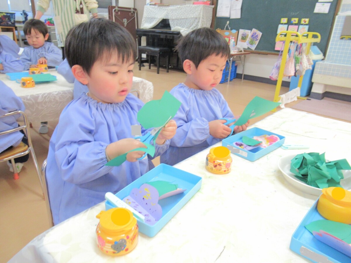 ☆ひよこ3組さんは、先日絵の具で取り組んでいたパンジーのお花の製作の続きに取り組んでいました🎵